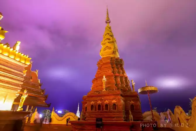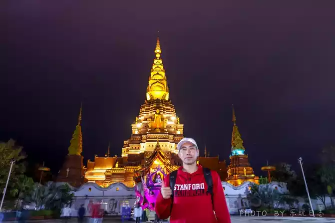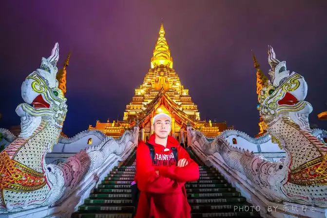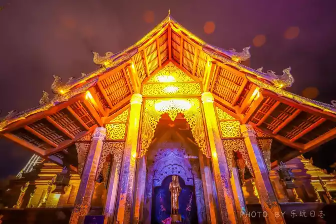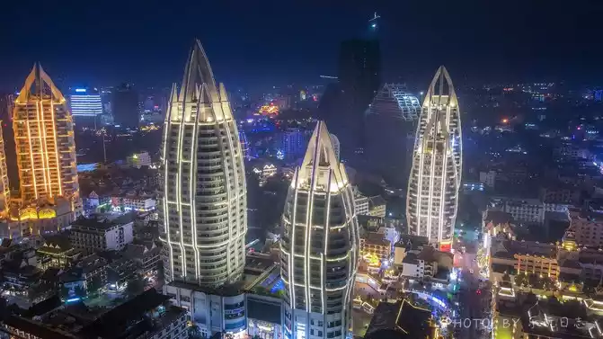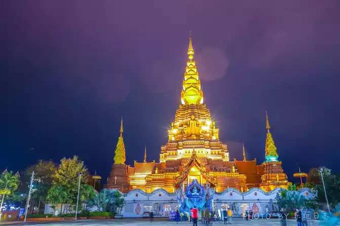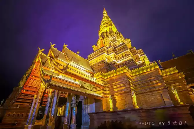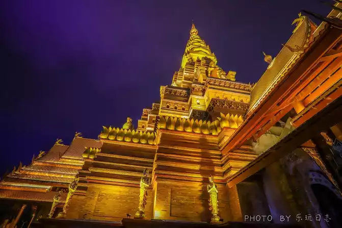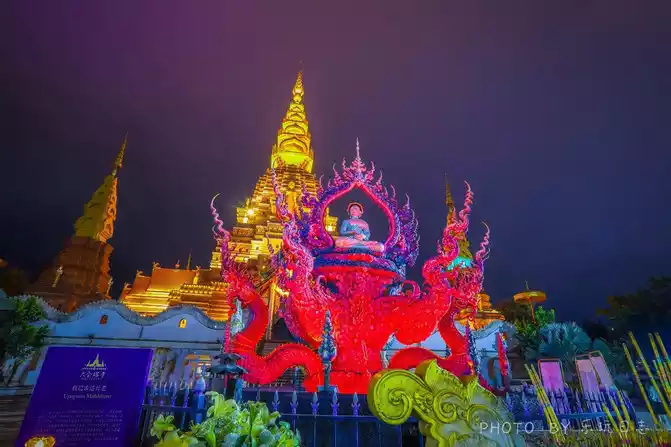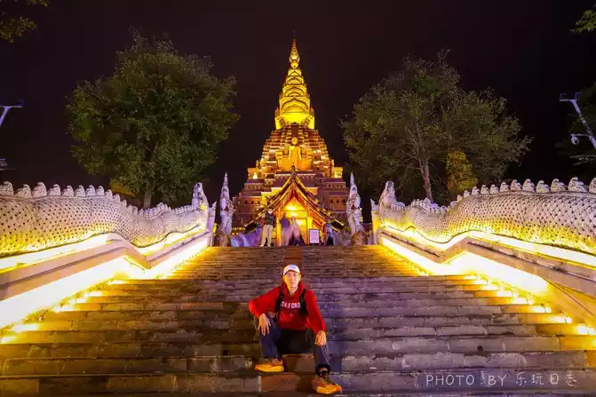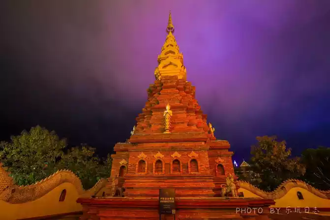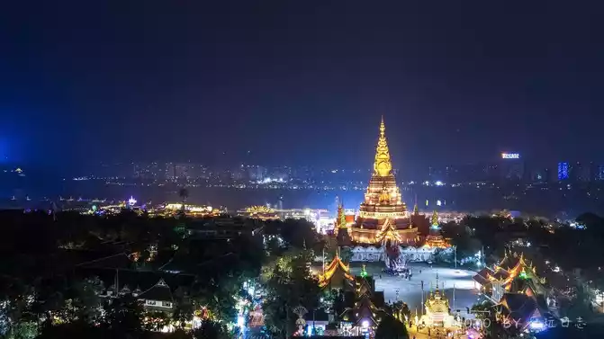 Because of itsgeographical proximity to Myanmar and Thailand, Xishuangbanna has a hint of exotic style in its national culture than many cities in China, for example, it can be seen everywhere in Jinghong City. Now let's take you to see the iconic attraction of Jinghong City, the night view of Shwedagon Pagoda Temple.