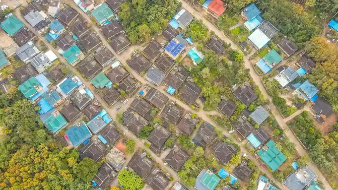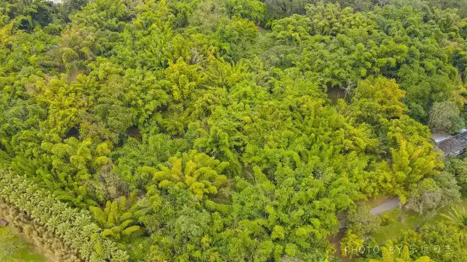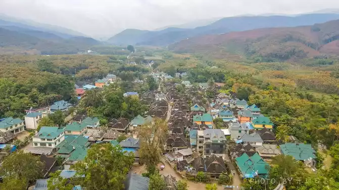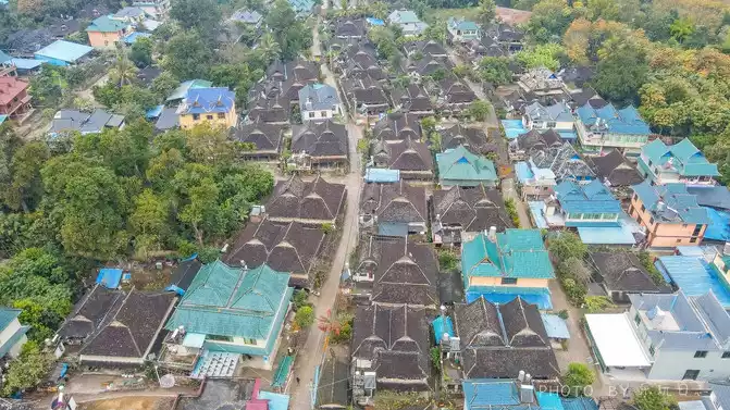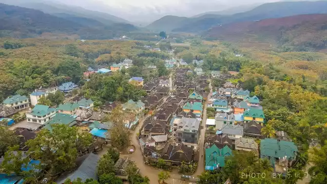 Under the aerial photography, the whole village is surrounded by a large area of tropical rainforest, the village is very simple and primitive Dai old buildings, each family has planted a lot of flowers and plants, living in the ancient materials is quiet, natural, is a very original Dai ancient village in Xishuangbanna.