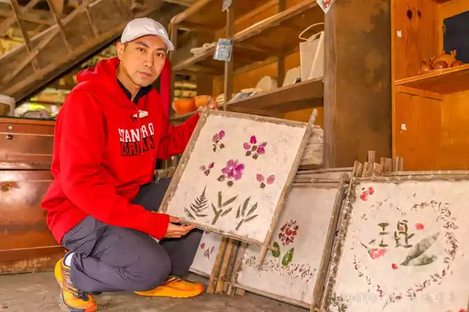 I make grass and flower paper here, which is to put some of my favorite flowers and leaves on the paper, and after drying, this beautiful pattern is formed.