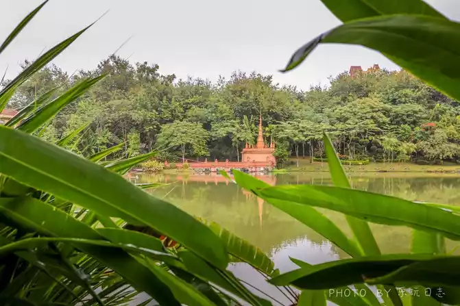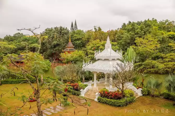 The garden has natural landscapes such as flowers and trees, as well as artificially cultivated exotic flowers and cultural buildings with strong Dai characteristics.