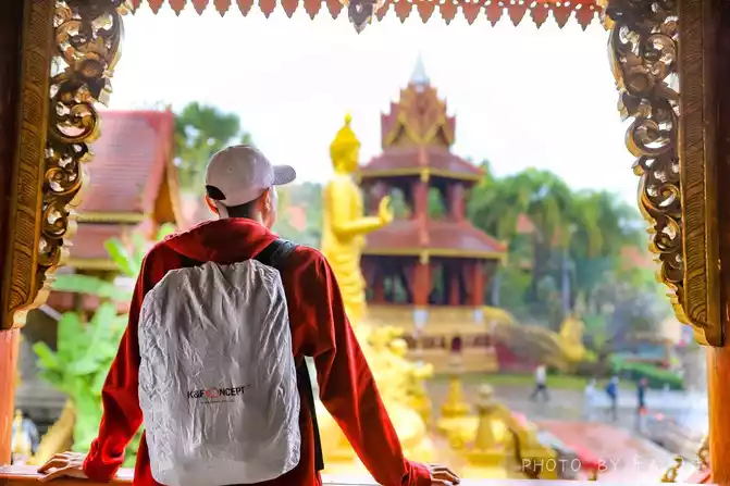 peacock on the eaves of the pavilion is a symbol of auspiciousness, happiness, beauty and kindness in the hearts of the Dai people. Inside the tower is an Emerald Buddha carved from Mekong stones.