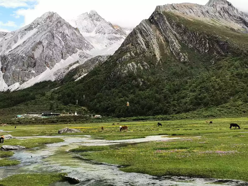 Xinduqiao Town is 3,460 meters above sea level, is a town under the jurisdiction of Kangding City, Ganzi Tibetan Autonomous Prefecture, Sichuan Province, is a highlight on the Sichuan-Tibet line, here is a photographer's paradise, the Chayagou River (the upper source of the Liqiu River, a tributary of the Yalong River) flows slowly, and the surrounding beautiful and primitive natural scenery is everywhere. You can also go to the observation deck of Yingguan Village in Waze Township to look at the main peak of Gongga in the distance. There is also a heavenly burial platform here, if you are lucky, you can witness the sky burial, which is a traditional funeral method of the Tibetan people, the body of the deceased will be swallowed by vultures after being brought to the designated location, do not take pictures when watching, and respect the local customs. There is also the cultural landscape Curie Temple, which is one of the Huangjiao temples in Kangding County, with precious Sanyi cultural relics and fine bronze statues of the Five Buddhas.