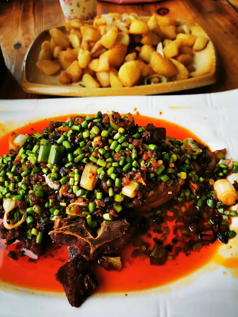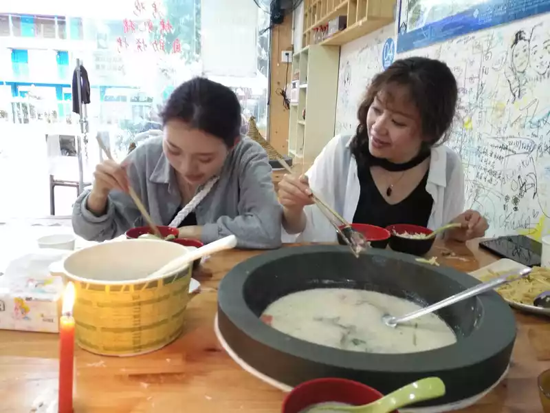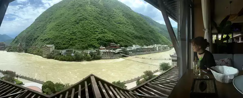 rained heavily yesterday, and it was very fresh in the morning, with the big trough river next to it rushing majestically and the mountains in the distance shrouded in clouds and mist, like a dream. There is a canteen next to the Dacaohe Hotel, there is breakfast to eat, we asked for 3 bowls of glutinous rice balls, which are quite delicious.