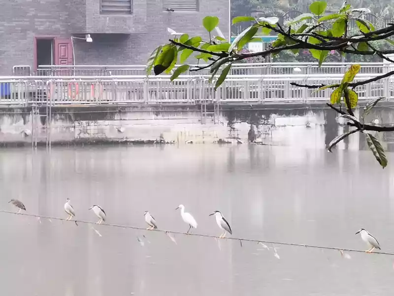 ropes are stretched horizontally on the river in the distance, on which many birds are resting, and man and nature live in harmony.