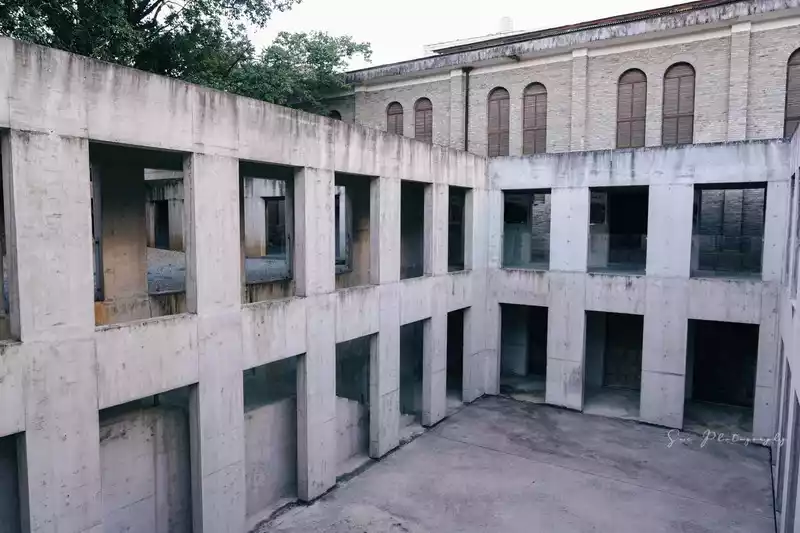 Vintage long windows adorn the gray brick walls, which are the facades of an abandoned cinema.