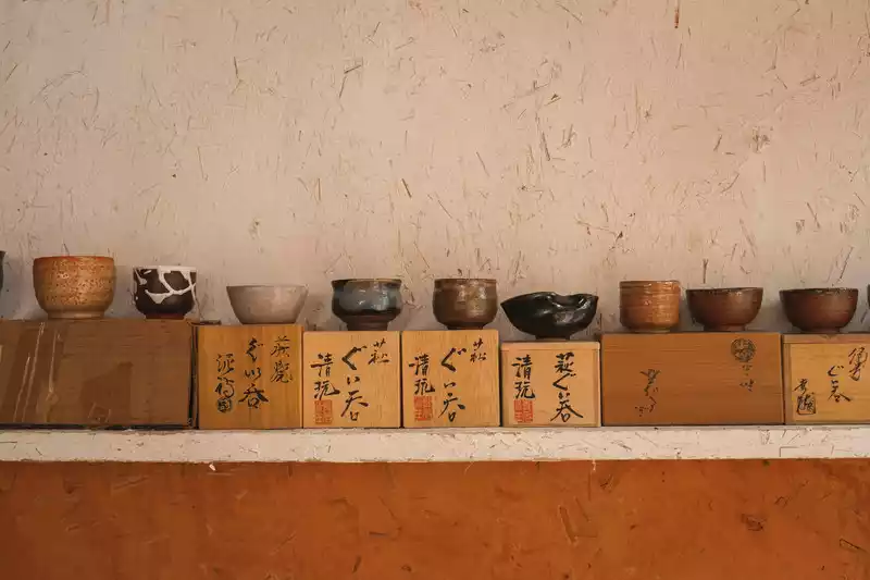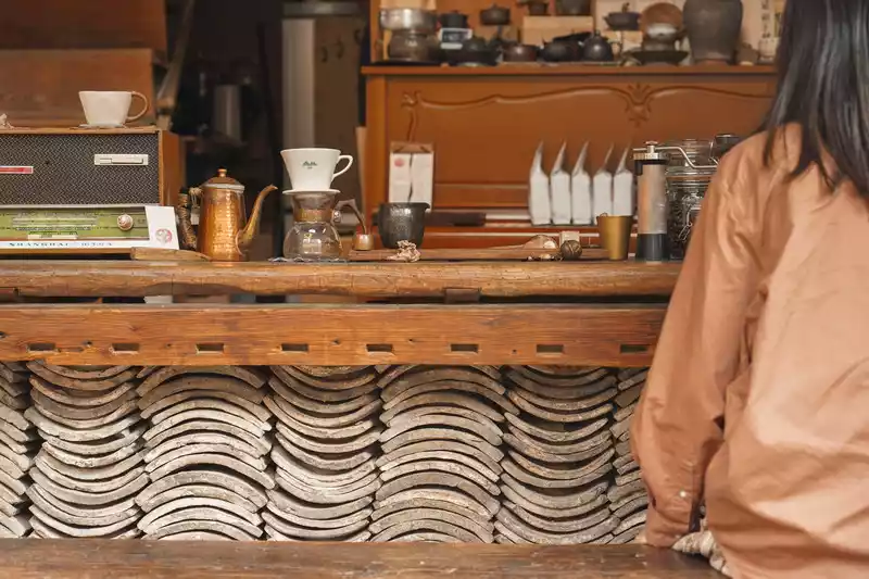 Tiled up, old-fashioned planks have been sanded to a smooth countertop, simple coffee making utensils, Kinu hand grinder, copper pot and filter cup from Kalita, It formed the bar. The Japanese handmade pottery cups on the wall are displayed in one word, which shows the owner's unique love for utensils.