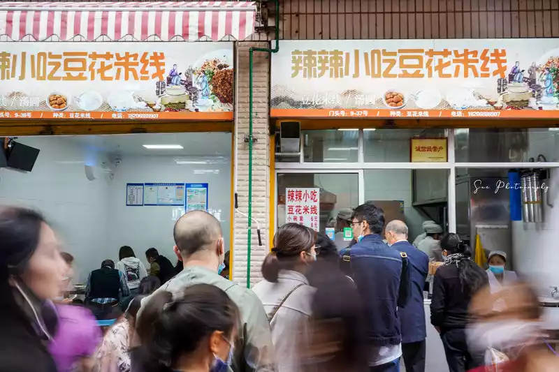 tofu pudding rice noodles of the spicy snack are simply delicious in the world, and the tofu pudding that glides through the mouth is paired with the spicy rice noodles, which is really delicious! The front of the store is surrounded by water, full of diners who come to order or take away.