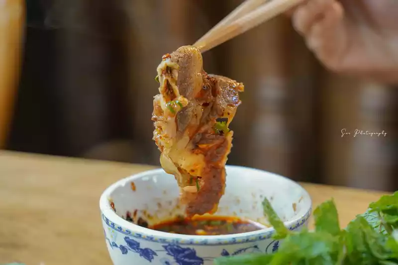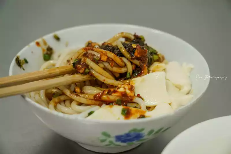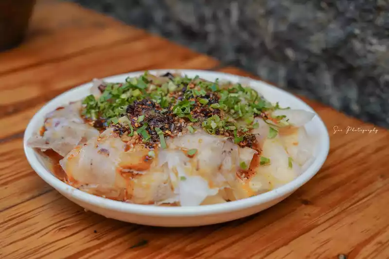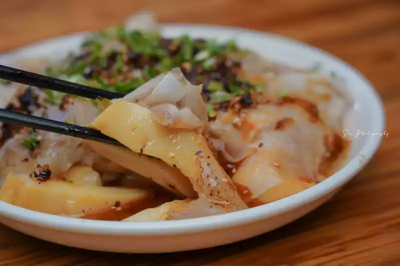 The large thin slices are pork slices cut as thinly as cicada wings, light and refreshing, seasoned with chili powder, and inhaled with jelly-like bean flour, which is the taste of wanting to eat one bite after another.