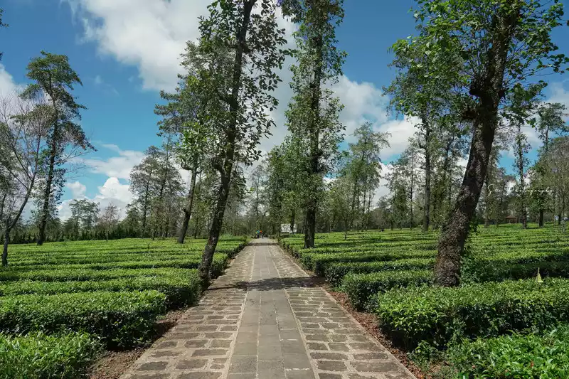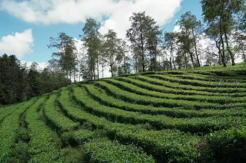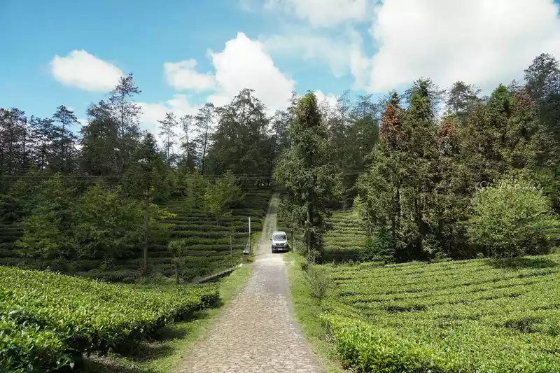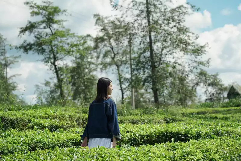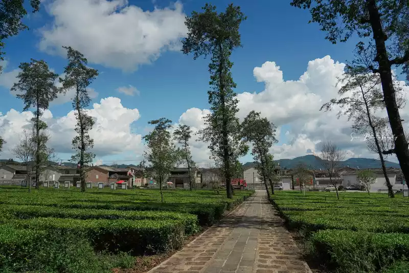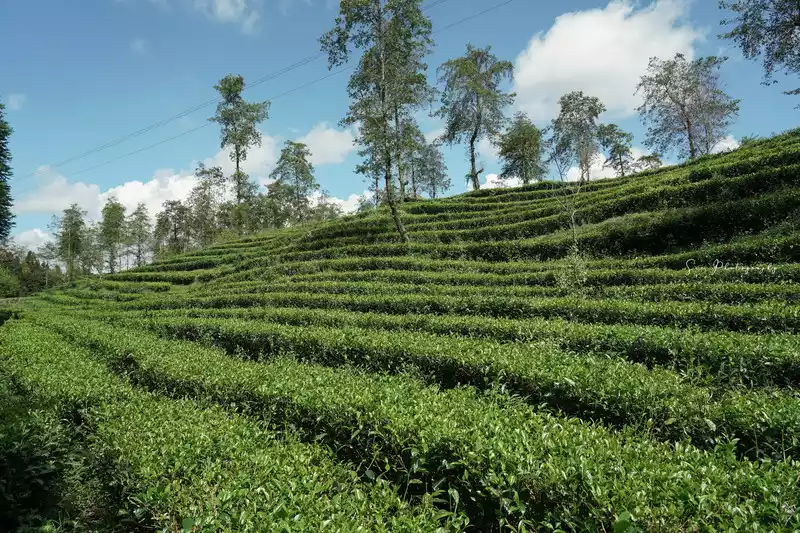 large tea garden outside the thatched house extends into the distance, when the weather is sunny, it is glowing greenery, and when it is rainy, it has a unique artistic conception, walk into the tea garden path and feel it slowly. It is also very nice to take pictures.