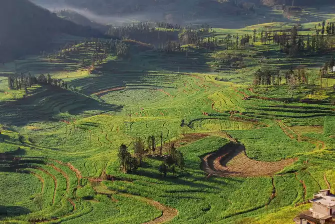 Luoping screw field is located in Niujie, ten kilometers northwest of Luoping County, Qujing, Yunnan. Therefore, there is also another name for "Cow Street" rape flower. The terraces here are circle-shaped, and from a distance they look like spirals on screws.