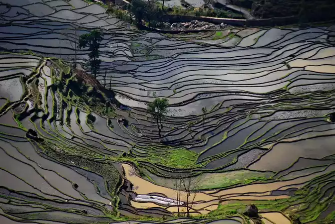 The terraces reclaimed by the Yuanyang Hani people change with the terrain of the mountain, and the large slope is reclaimed, and the steep slope is small to reclaim the small field, and even the stone gaps under the ditch are also opened, so the terraces are several acres, and the small ones are only the size of a dustpan, often there are thousands of acres on a slope.