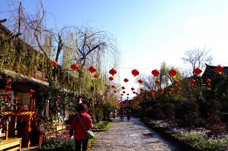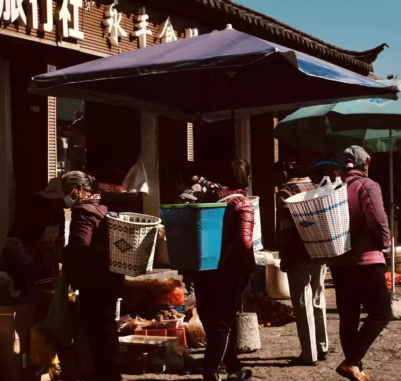 It took about half an hour from the airport to the ancient city of Lijiang, the road was unimpeded, humming a little song, and arrived at the parking lot, the ancient city could not drive, we dragged our luggage past the market in the ancient city, everyone was carrying a basket behind them, full of New Year's flavor.