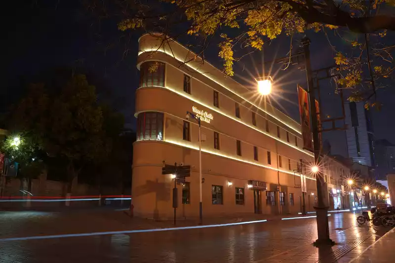 Pass by the door of a vintage hotel