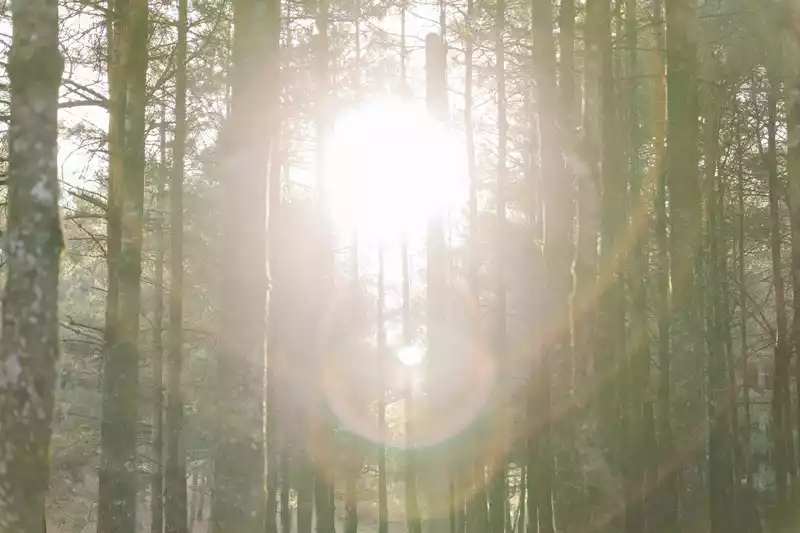 A faint spot of light shone on us through the woods, and the pine needles that fell on the ground were hot from the sun, and our feet were soft on them.