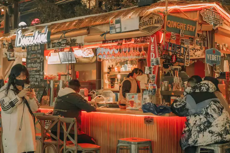 Therefore, when the Nanqiang Street Night Market arrives, every young person is happy. One by one, there were small lattice houses, and several young people sat around the door of the beer shop.