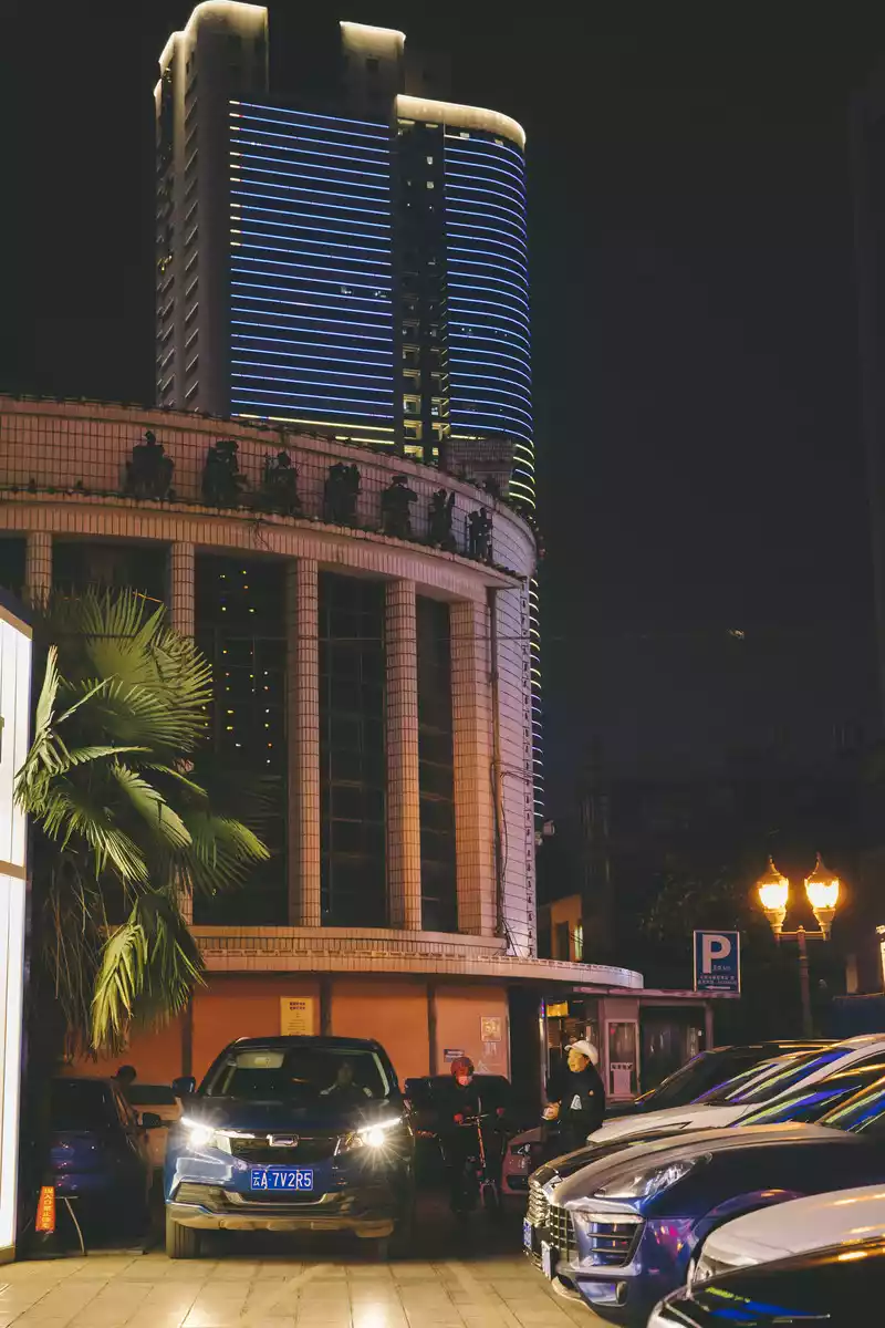 Standing under the wine glass building at night, it seems that people have traveled to a certain European city, the neon lights light up the prosperity of the city, the night is getting thicker, and pedestrians passing by the wine glass building will raise their mobile phones to take a photo of the wine glass building under the hidden moonlight.