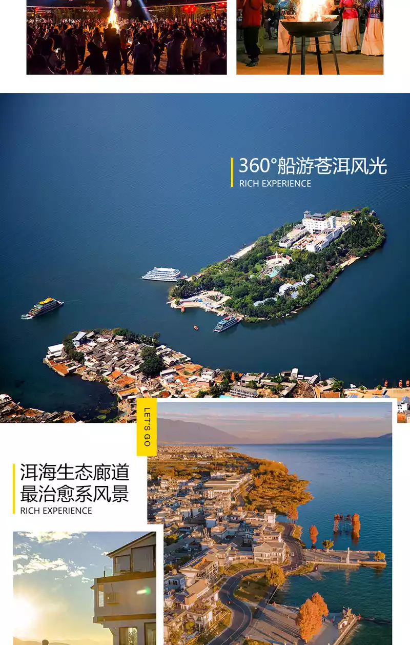 Then, we will go to the most beautiful Erhai Lake to take the [Erhai Lake Cruise], which is the location of the Erhai Moon, one of the four views of Dali's wind and snow, and you can enjoy Erhai Lake time with plenty of time. Looking down from the air, Erhai Lake is like a crescent moon, lying quietly between Cangshan and Dali Dam, and is named "Erhai Lake" because it is shaped like an ear. After that, climb the "Relic Water City" [Jinsuo Island] Jinsuo Island looks down from a high altitude, and the island is like a weaving shuttle, lying on Erhai Lake, so it is named Jinsuo Island. In the legend of Dali, a fairy who is good at weaving colorful brocade in the sky left her golden shuttle in Erhai Lake, and the golden shuttle was transformed into an island and became a beautiful scenery on earth. After that, go to explore the underground cave [Dragon Palace] to watch the large-scale song and dance performance of the original ecology of the Bai people in Dali "Charming Golden Shuttle Sea Cauliflower".