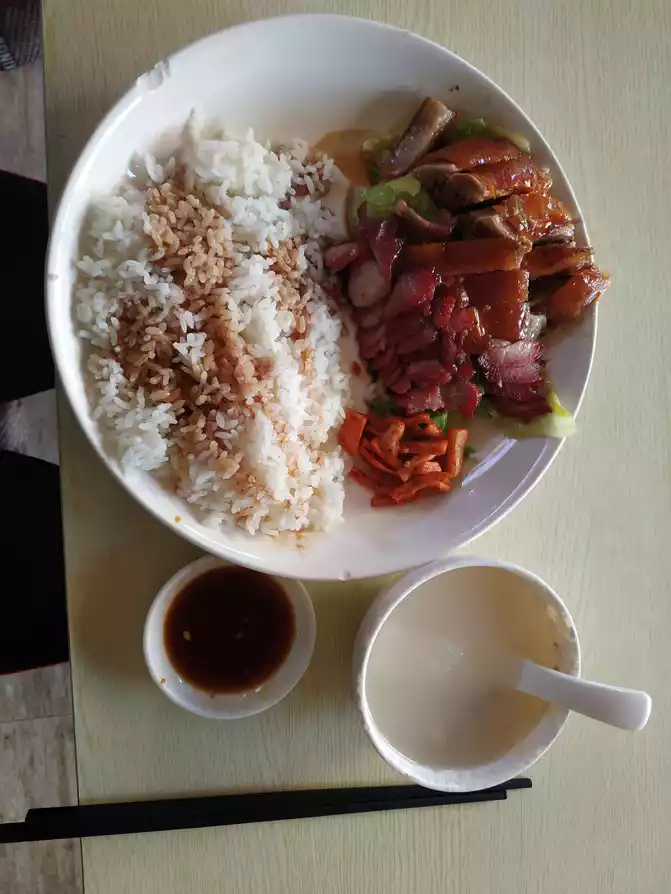 Having a somewhat early dinner, I had barbecued pork and roast duck rice.