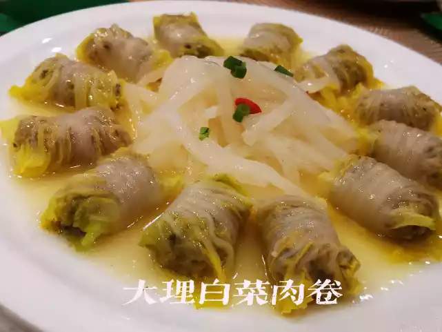 In the Changhu store of Bai Village, Dali, Nanning, in addition to Yunnan cuisine such as wild mushroom soup, there are also many delicacies, such as thousands of meat, roasted donkey meat, vegetable rolls, fresh toon omelettes, ham meat, double crisp, chongcai, sea cauliflower (water-based poplar), fresh banlan root, etc., all of which are seasonal delicacies in Yunnan.