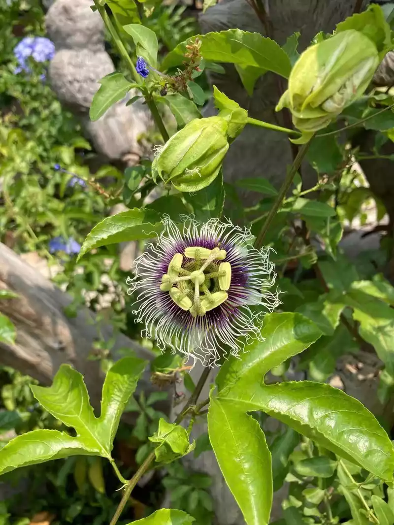 Thenext day, I invited my friends to eat at the Languigu Restaurant, and a local friend told me that a vine man, in the atrium of the restaurant, is passion fruit, this vine man, it will grow along the wall, decorate the house, and the fruit can be eaten at will, and the flowers it blooms like this: