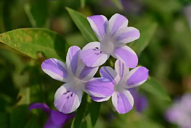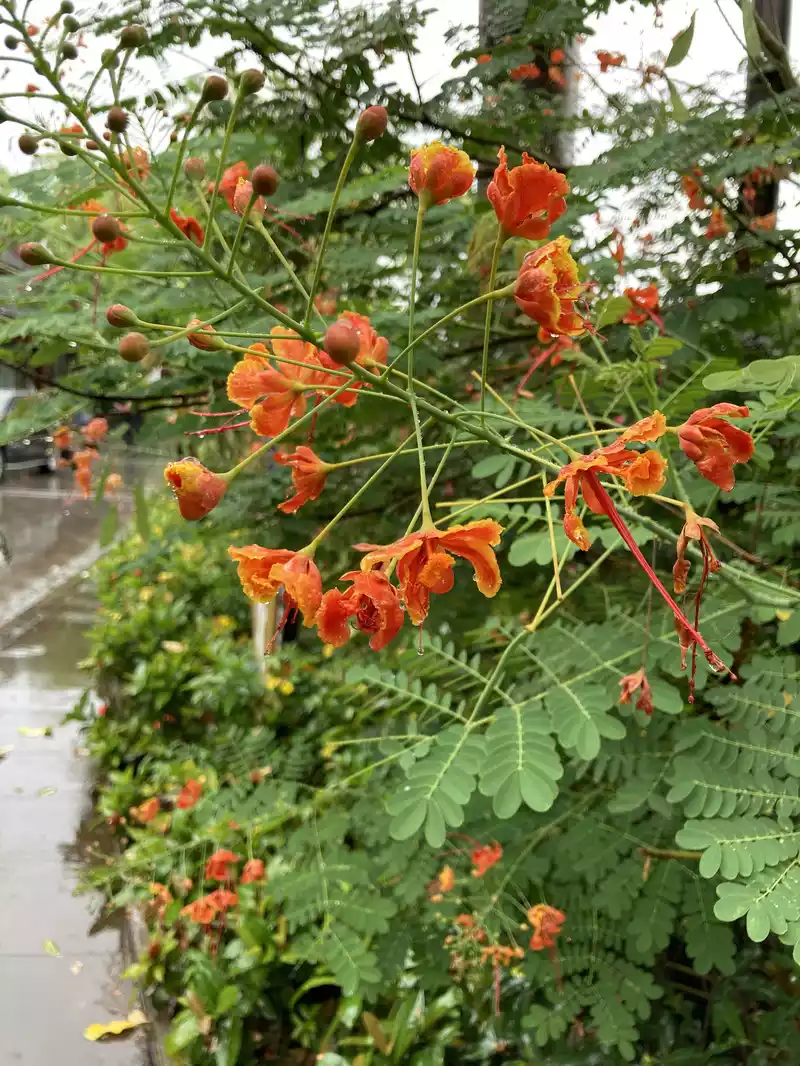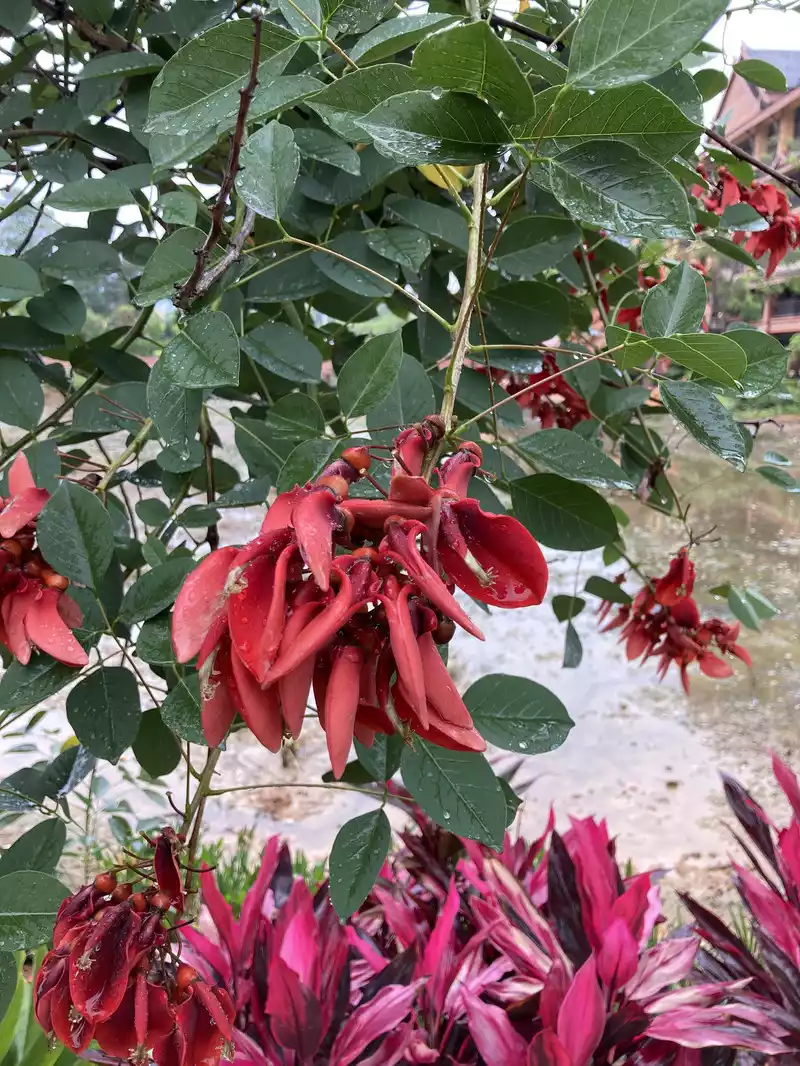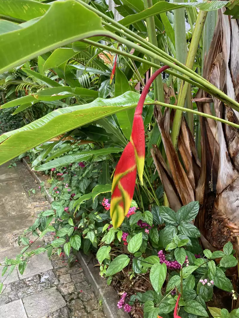 Along the creek, various tropical flowers bloom greedily in the rain: