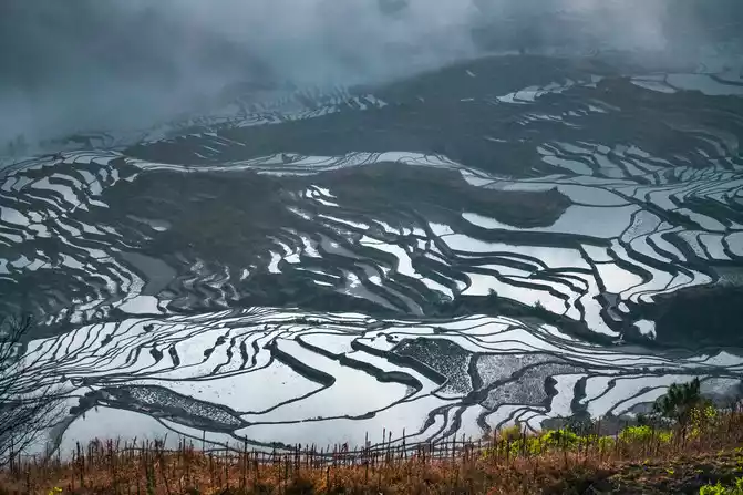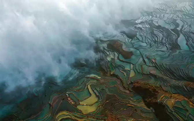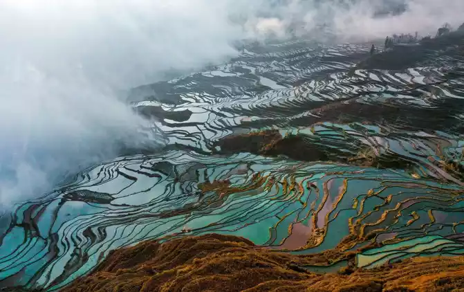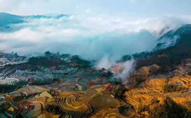 Yuanyang Terraces are located in the southern part of Ailao Mountain in Yuanyang County, Yunnan Province, and are masterpieces left by the Hani people for generations. "A mountain is divided into four seasons, ten miles of different days", the locals adapt to local conditions according to the changeable geographical climate, the terraces change with the terrain of the mountains, the gentle slope is large to reclaim the field, the steep slope is small to reclaim the small field, the large one occupies several acres, the small one is only the size of a dustpan, often there are thousands of acres on a slope. So there is this irregular terraced line, big and small like God's palette.