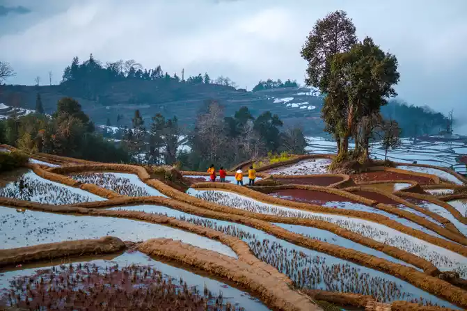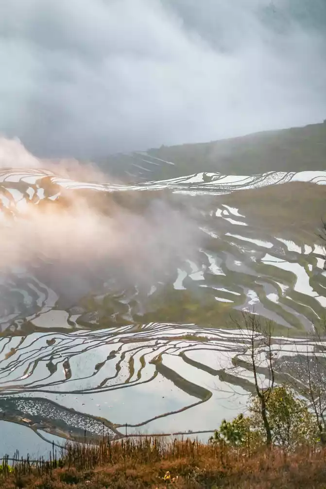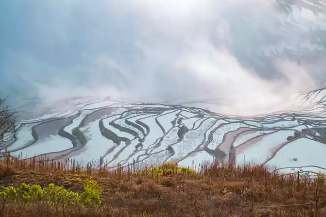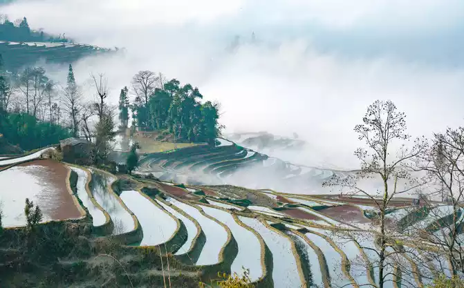 From November to April of the following year, it is the irrigation season of the Yuanyang Terraces, and it is also the peak travel season for the Yuanyang Terraces. The irrigated terraces are like countless mirrors, broken on the earth, reflecting the light of the sky, truly recording every sunrise and moonset, every cloud and rolling.