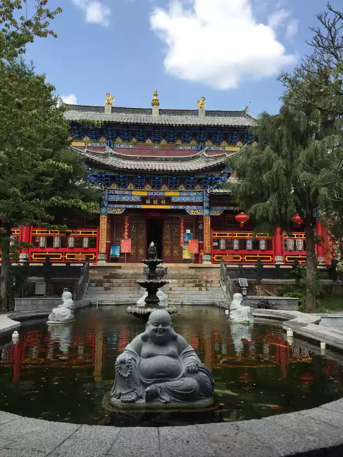 Fuguo Temple on the way, a Tibetan Buddhist temple, grand and solemn. The bottle is filled with fairy flowers, and the brocade trees are full of treasures; The incense burns and sandalwood falls, and fragrant clouds penetrate the clear sky.