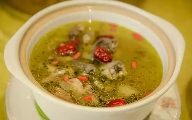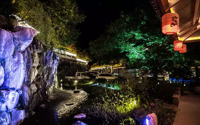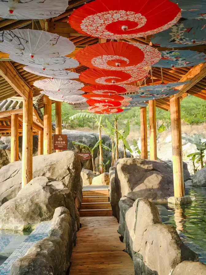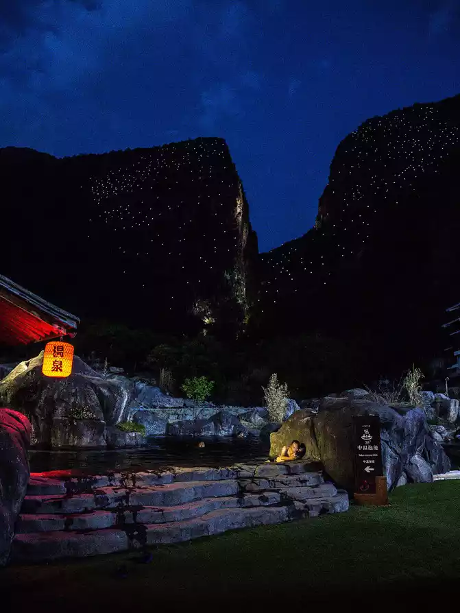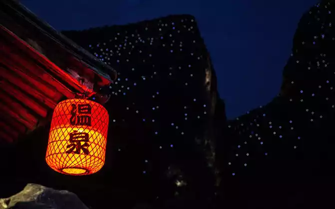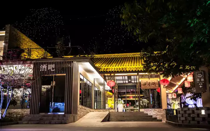 At night, the lanterns are lit with red light, reflecting the entire soup pool, which is more leisurely and comfortable.