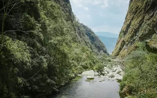 Crossing the vermilion Fuyuan Bridge, you will see two peaks facing each other, majestic and majestic, as if they are a gate set up by the gods in the sky for the flower garden of the heavenly court , only a V-shaped valley is exposed, so it is named "Shimen Pass", that is, "Tiankai Stone Gate".