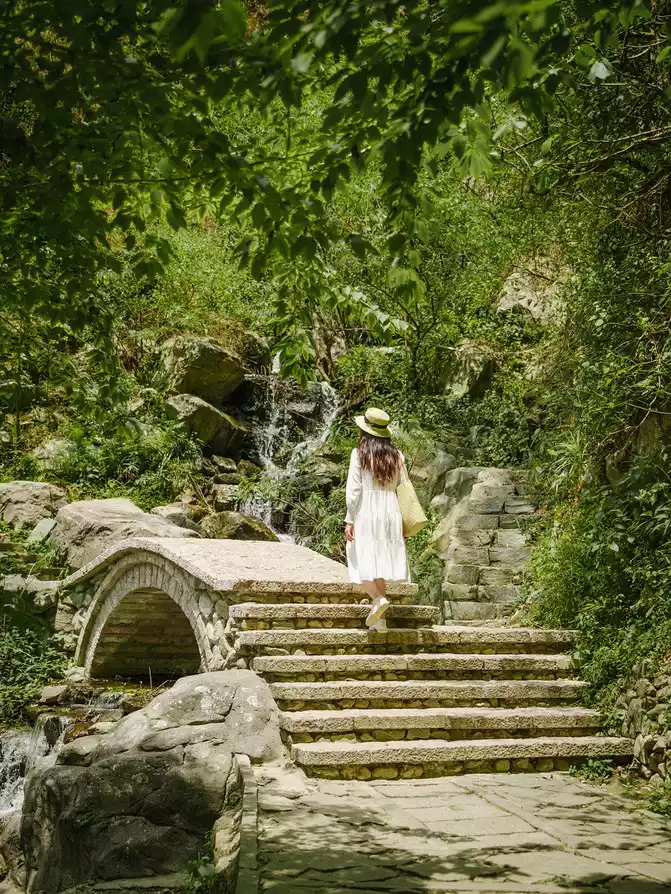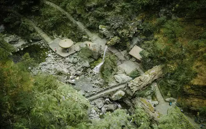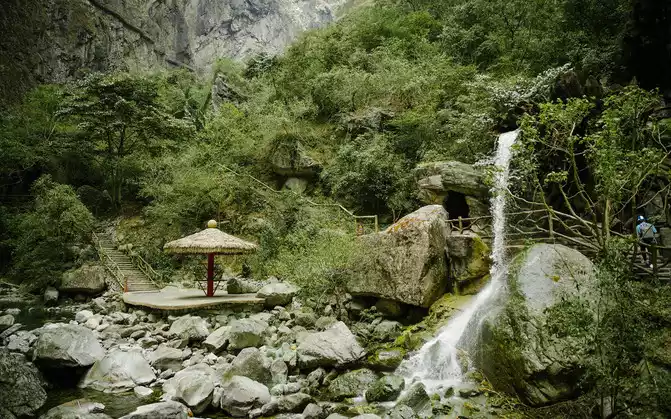 , we crossed the Wanshou Valley, there were two forks, one leading to the rest pavilion on the left, where you can feel up close as if pouring from the fairy pot of the heavenly maiden, layer upon layer of the seven water waterfalls splashing on the rocks, you can also choose the right side, slowly approach and feel during the journey.