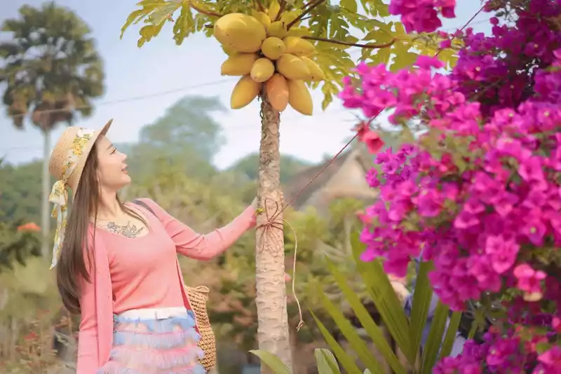In the garden, you can see the king lotus with leaves as big as a dustpan, firecrackers shaped like firecrackers, birds of paradise flying like birds, bougainvillea with flower-shaped leaves, egg-yellow frangipani, dancing dancing grass, shy trees and shy grass, rain trees that make rain, miracle fruits that change the taste and other tropical exotic flowers and trees, etc.