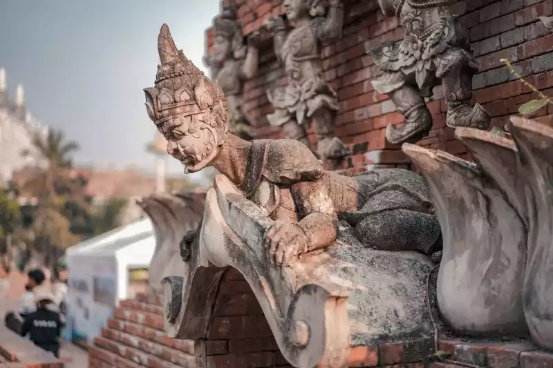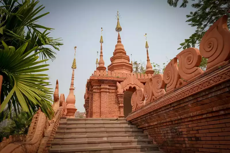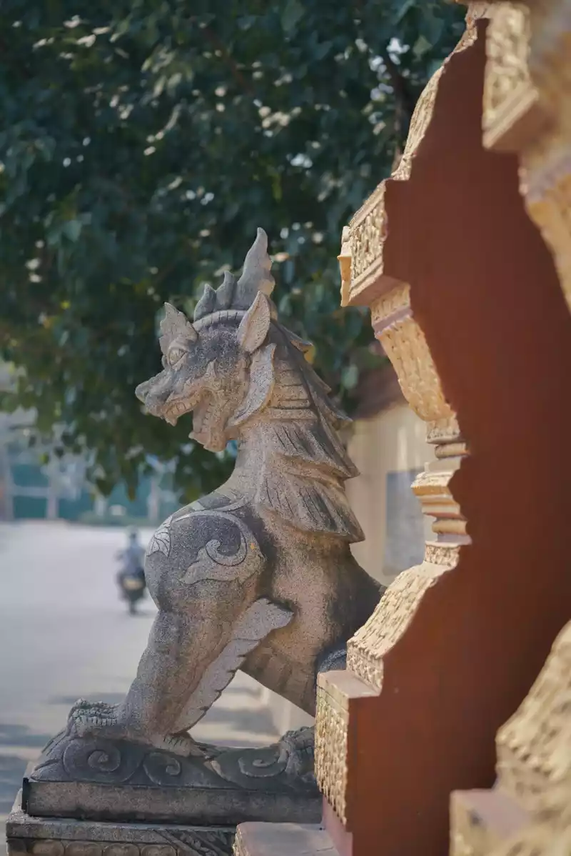 There is a characteristic solid small pagoda at each corner, surrounded by sphinxes guarding the pagoda.