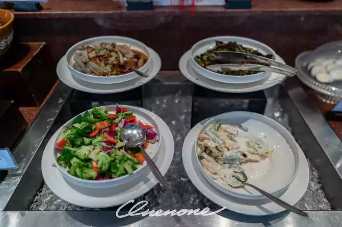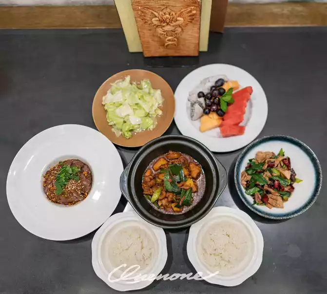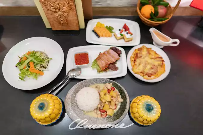 Chinese and Western-style set meals for two are relatively cost-effective, including cold yak beef, Xuanwei stir-fried pork, Yongping braised chicken, pineapple chicken risotto, Thai roasted pork neck, ham pizza, cream pumpkin soup, vegetable salad, desserts, seasonal fruits... every dish has just the right taste.