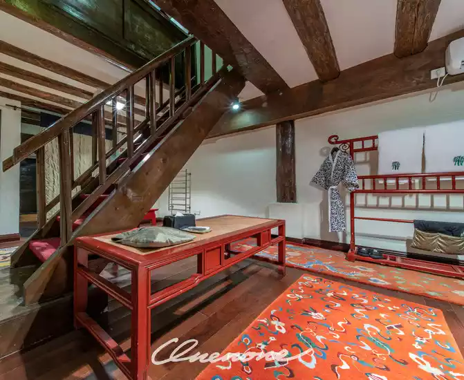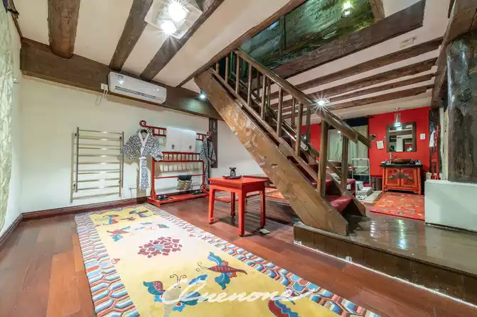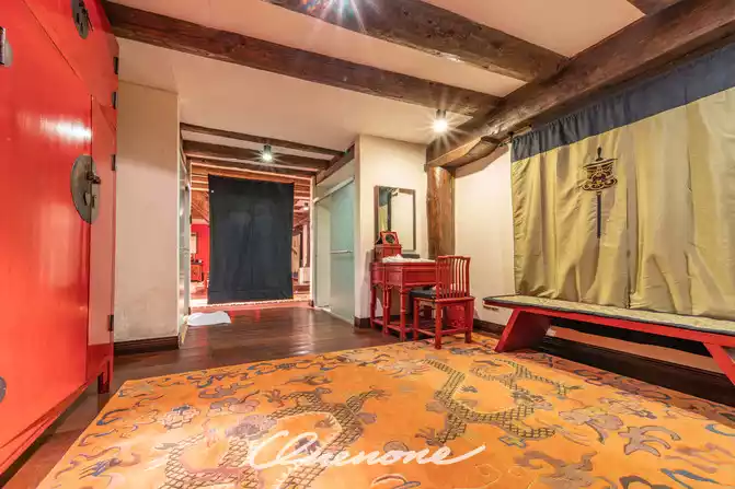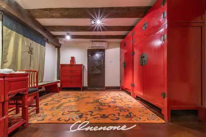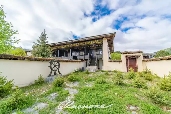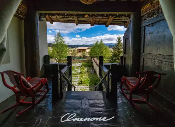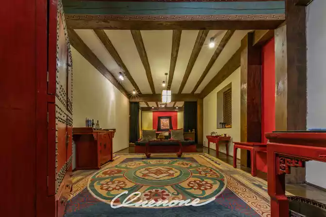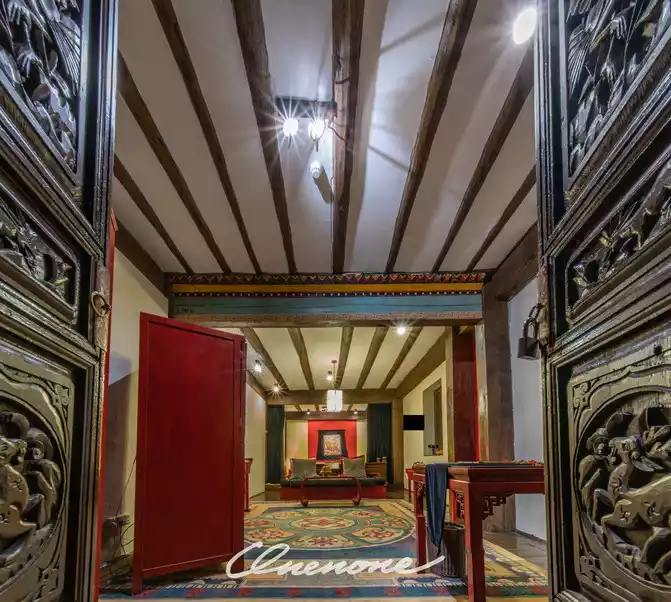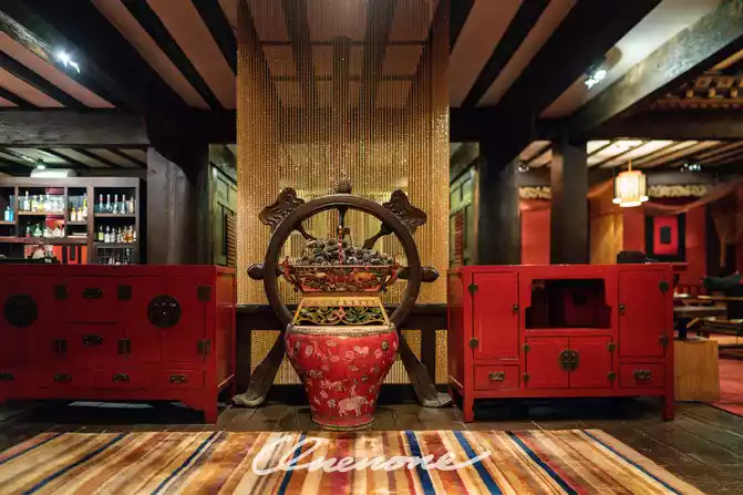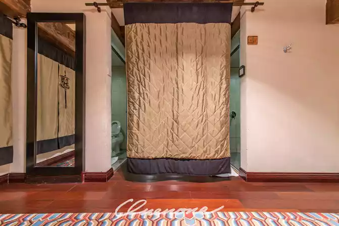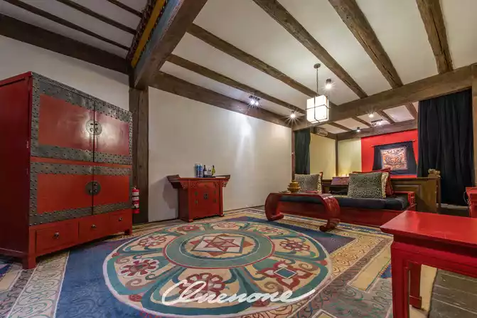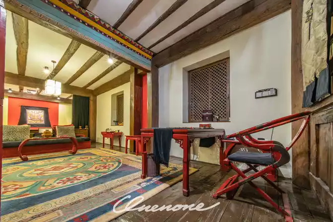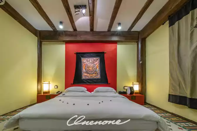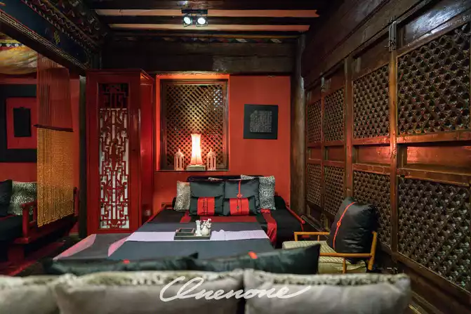 Live in a traditional Tibetan pastoral house with a narrow top and a wide bottom structure. It has an independent courtyard and a duplex attic. The upstairs is the bedroom and living room, and the downstairs is the bathroom, toilet and cloakroom. A handmade wooden bathtub is placed in the center. The color tone of the entire room is dazzling red and black, showing the aesthetic concepts and living atmosphere that are very different from those in the Central Plains. There are Thangkas hanging on the wall behind the big bed, a small bar transformed from a Buddhist niche, a beautifully crafted woven carpet on the floor, and various Tibetan-style decorations in the guest room. Even the nameplate of the guest room key is engraved with the name of the original owner of the house.