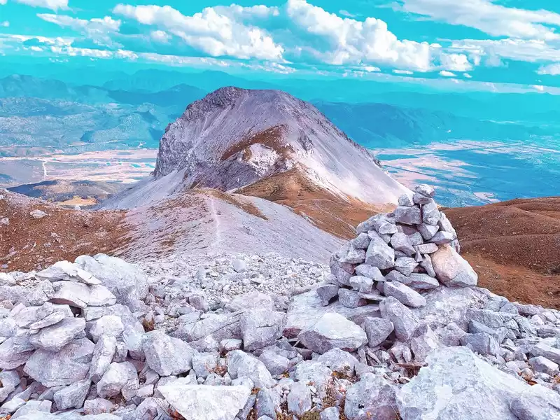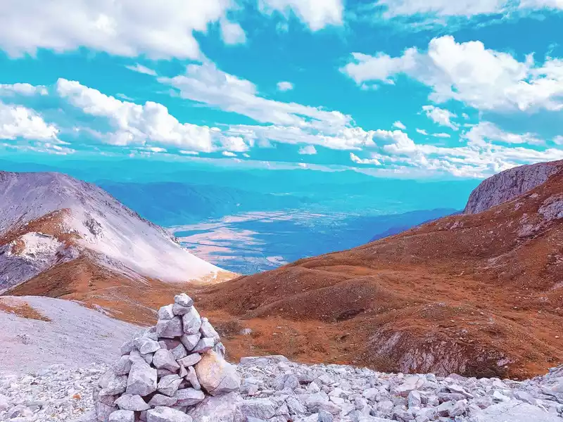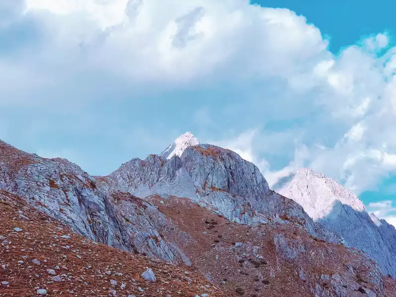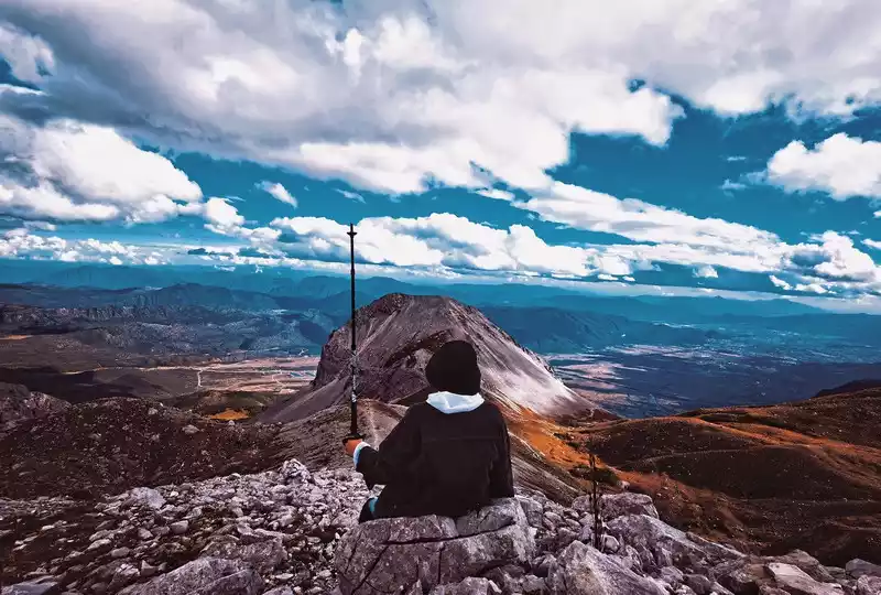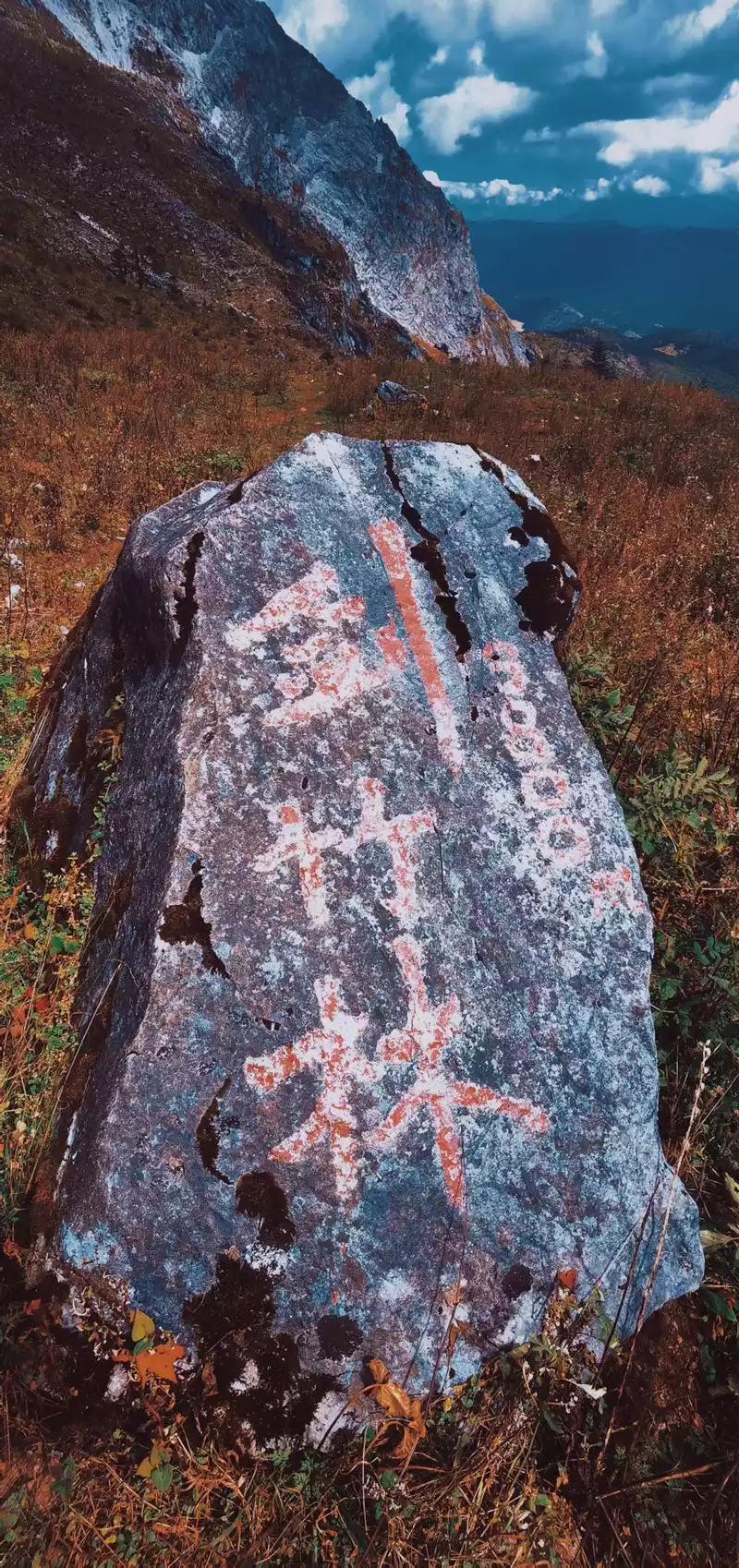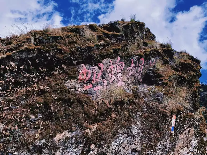 Further up, you'll reach the Green Snow Sea. The sign for the Green Snow Sea is on a ridge. After passing the sign, just follow the ridge. The altitude marking for the Green Snow Sea is seriously exaggerated; I estimate it's around 4,300 feet. As you go up the ridge, you'll see several Mani piles. Continue walking, cross the small hill behind the Mani piles, and you'll reach a rocky mountain. After crossing another small hill, you'll reach the end of this route - the Grand Canyon.