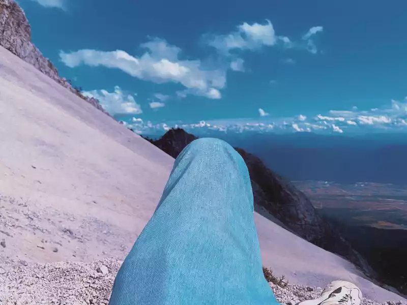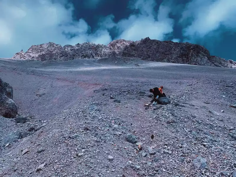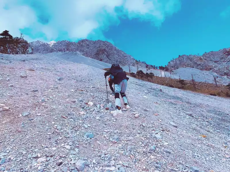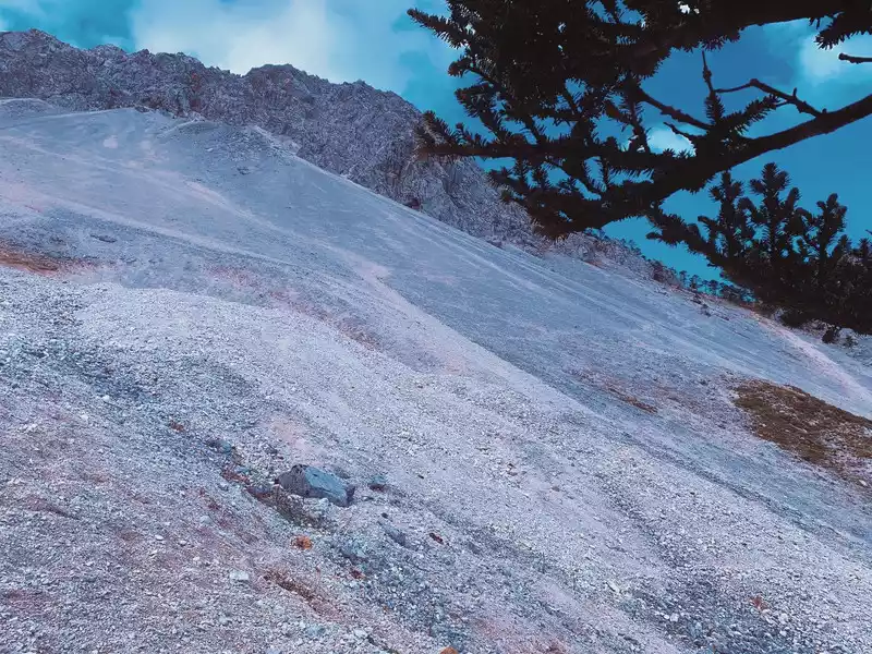 The quicksand slope is quite steep, and the zigzag pattern, with a vertical elevation gain of 500 meters, is incredibly demanding. My friend developed altitude sickness here and subsequently descended, while our guide and I continued our climb.
