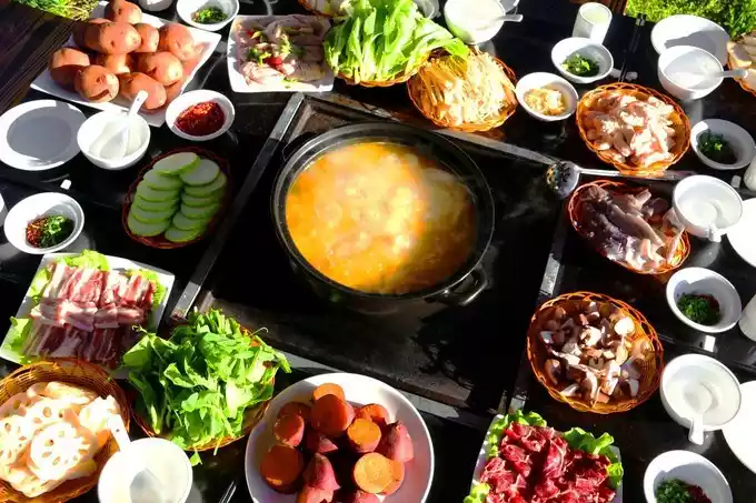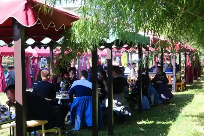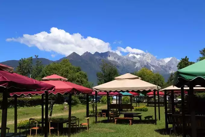 The Falcon Valley outdoor restaurant is sheltered from the rain and sun, nestled on a natural meadow. Diners can enjoy stunning views of the surrounding flowers and trees, the chirping of birds, and the stunning Jade Dragon Snow Mountain in the distance.