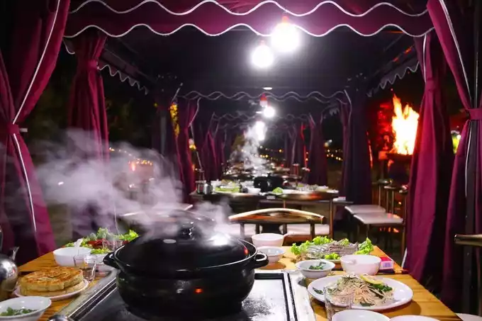 In the evening, we ate at the outdoor restaurant. Since it was crowded and lively, we had a free-range chicken hot pot, with grilling around the pot. As you can see from the photos, the food was plentiful and the night view was stunning.