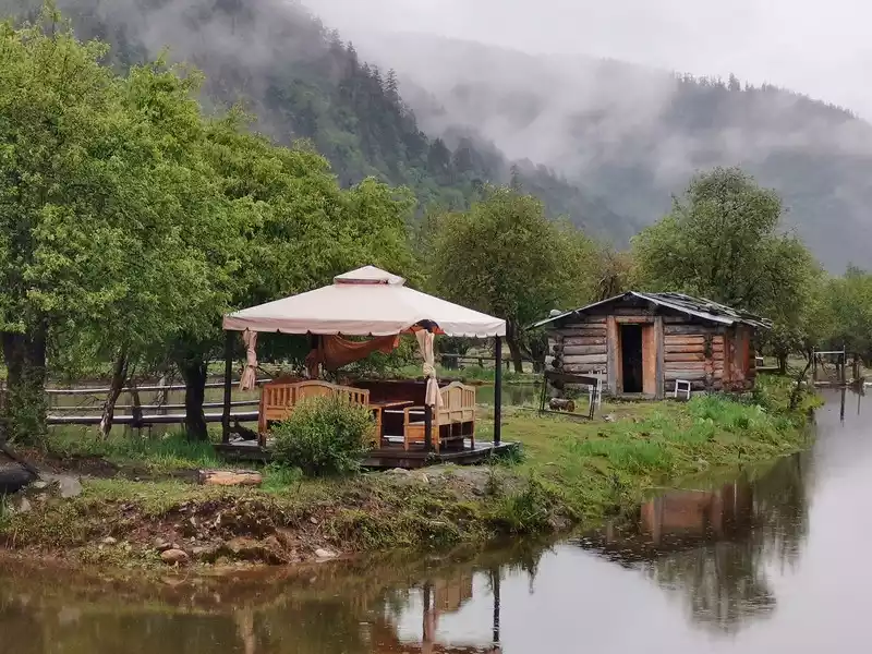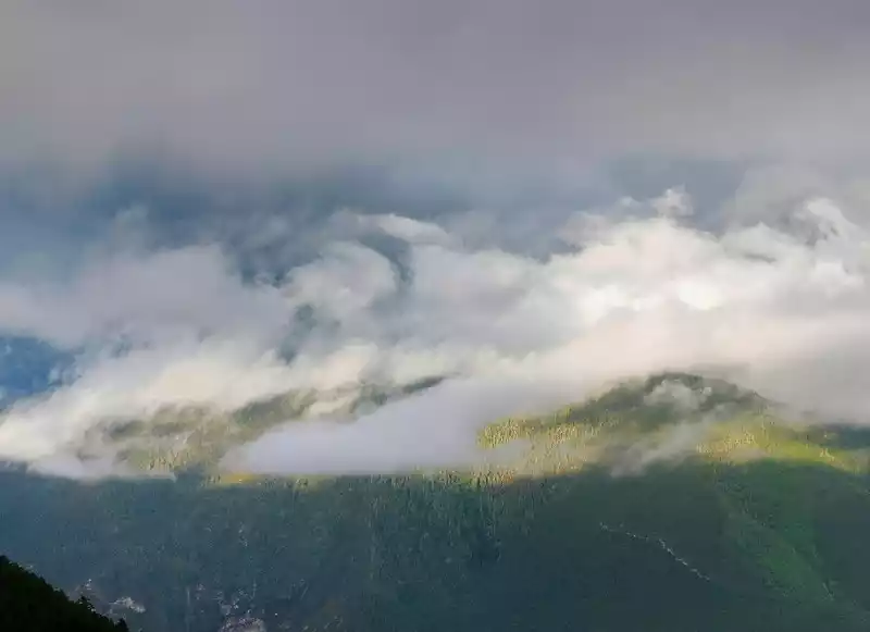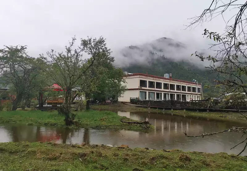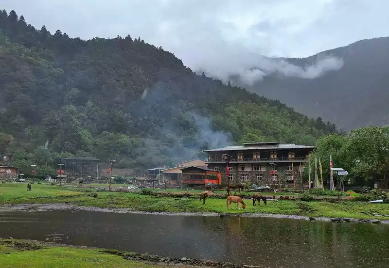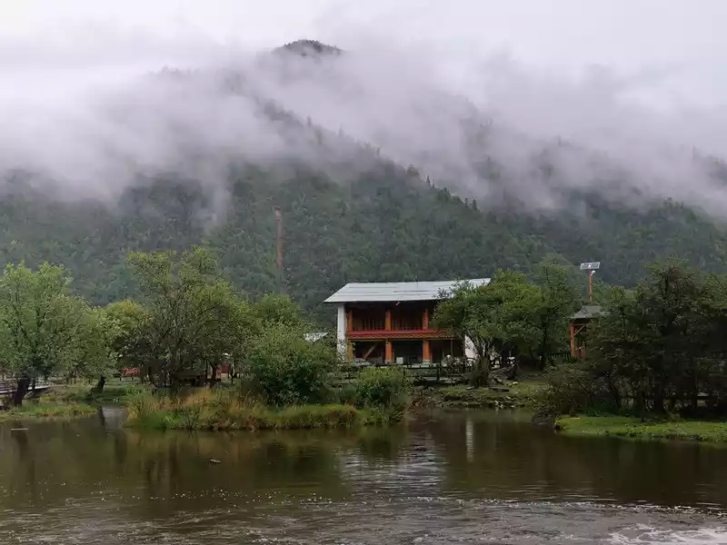 酒店位于一处较开阔的水丰草盈之地,周围则是群山环绕,小雨中的山峦仙雾缭绕,漫步其中,呼吸着沁人肺腑的空气,真是美妙极了。