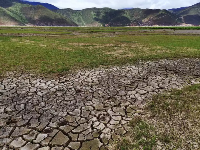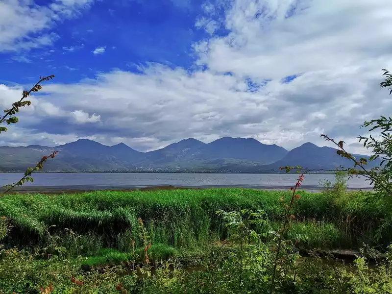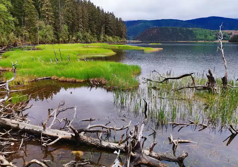 After entering from the plank road on the left and walking for a while, there is a gap leading to the grassland by the lake. Walking straight ahead is the location for shooting the panoramic travel photos of Songzanlin Temple: the edge of a swamp.