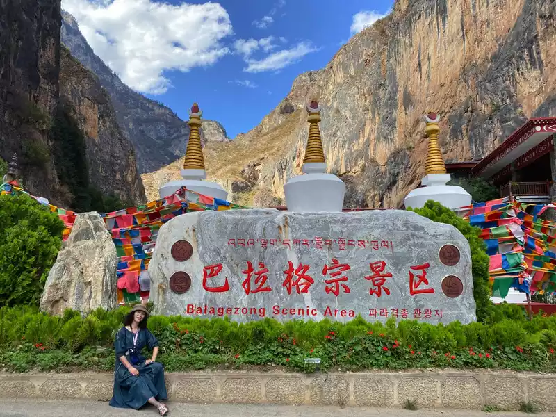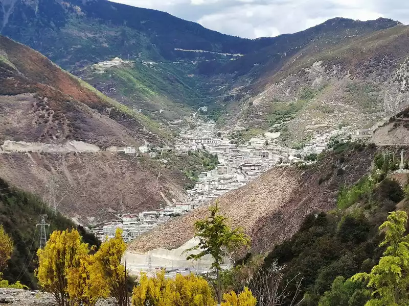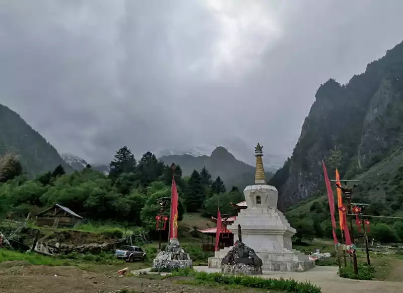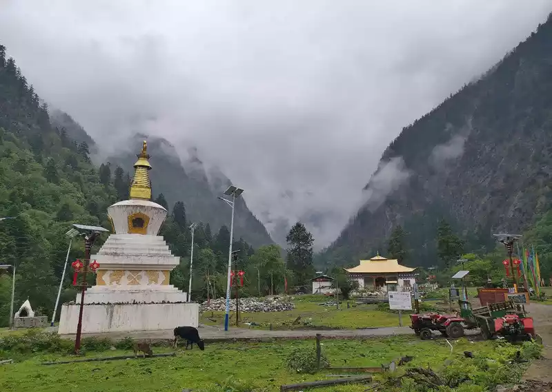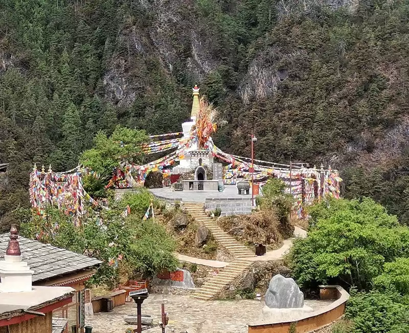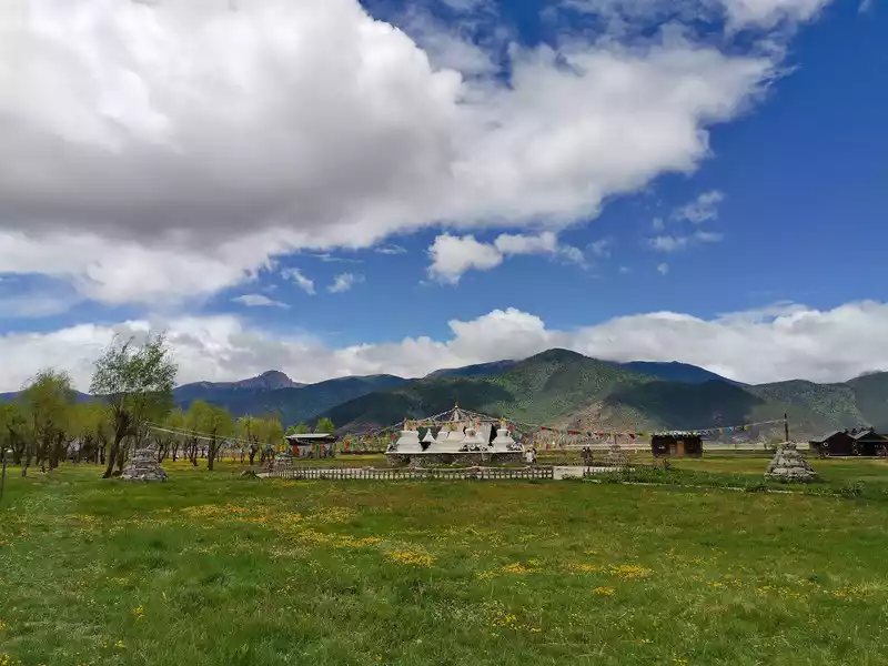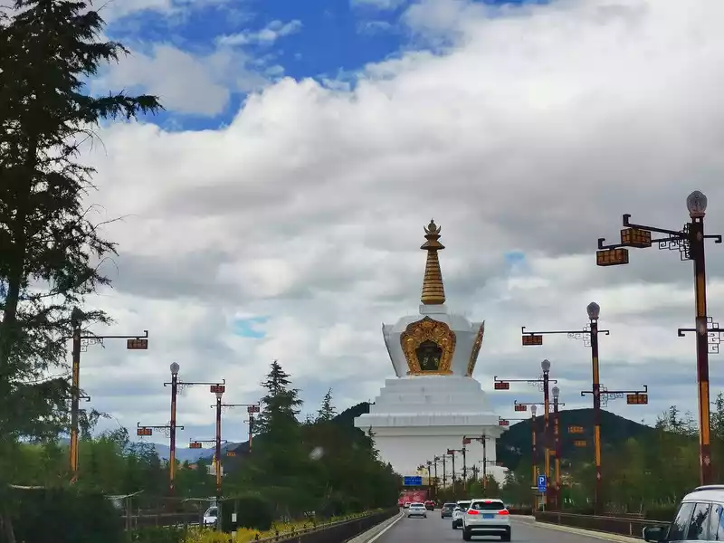 Leaving Xiaozhongdian Flower Sea along National Highway 214, we soon arrived at Shangri-La's Yingbin Avenue. From afar, we could see the tall white pagoda standing under the blue sky. Shangri-La, here we come.