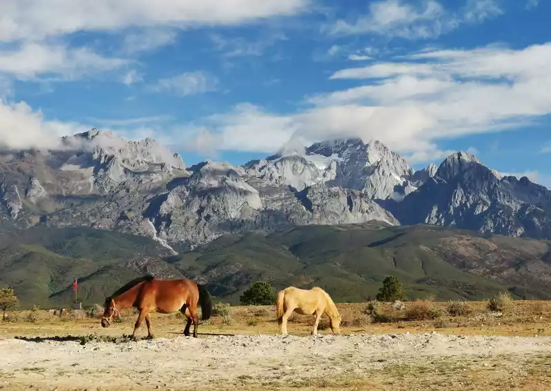 On the first day of the trip, we arranged to visit the Jade Dragon Snow Mountain Scenic Area. Yuhu Village is about a 20-minute drive from the Jade Dragon Snow Mountain Scenic Area. Our chartered car driver picked us up on time at 8 o'clock in the morning and set off from Yuhu Village. The weather on the first day was fine, with blue sky, white clouds and snow-capped mountains along the way. On the yellowed grass, the early-rising horses were leisurely grazing.