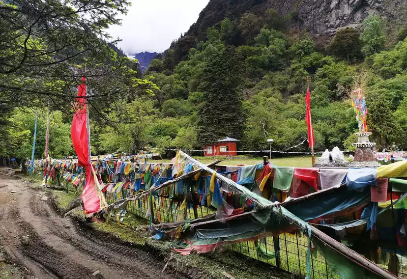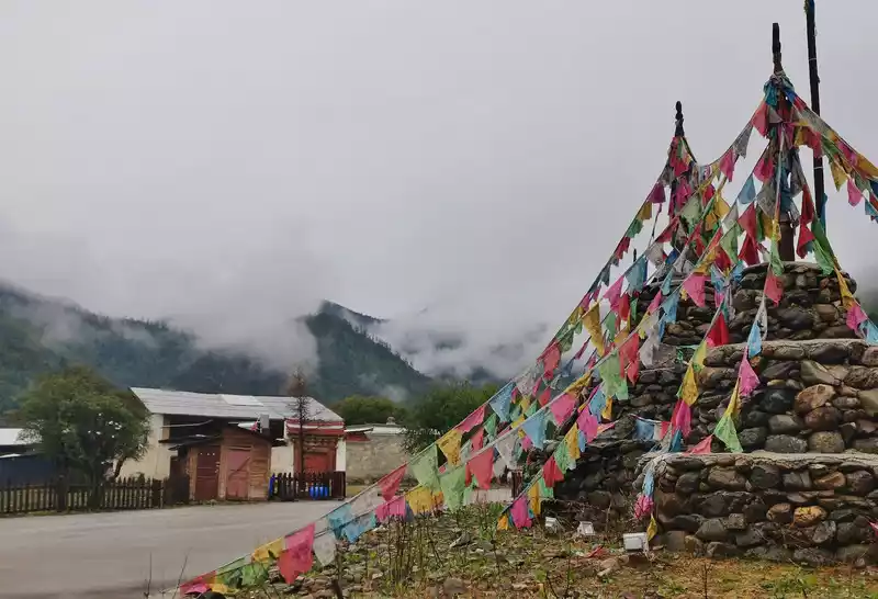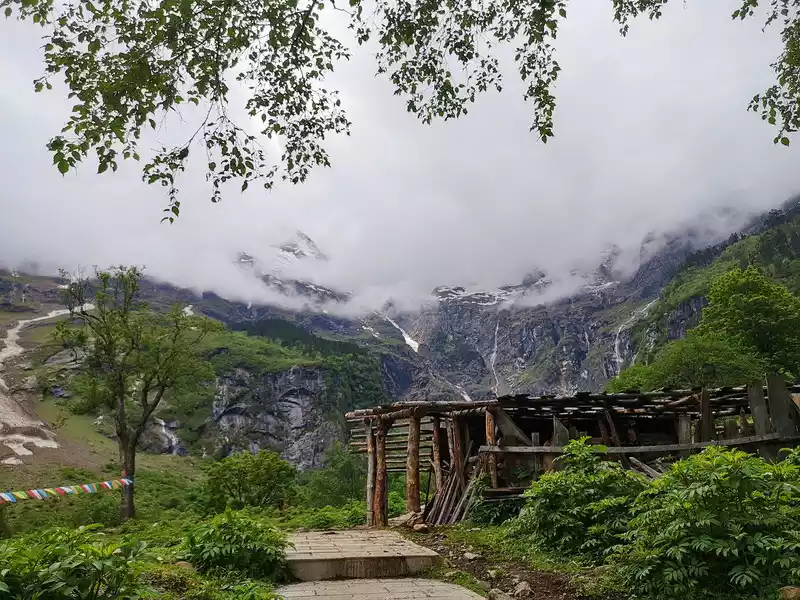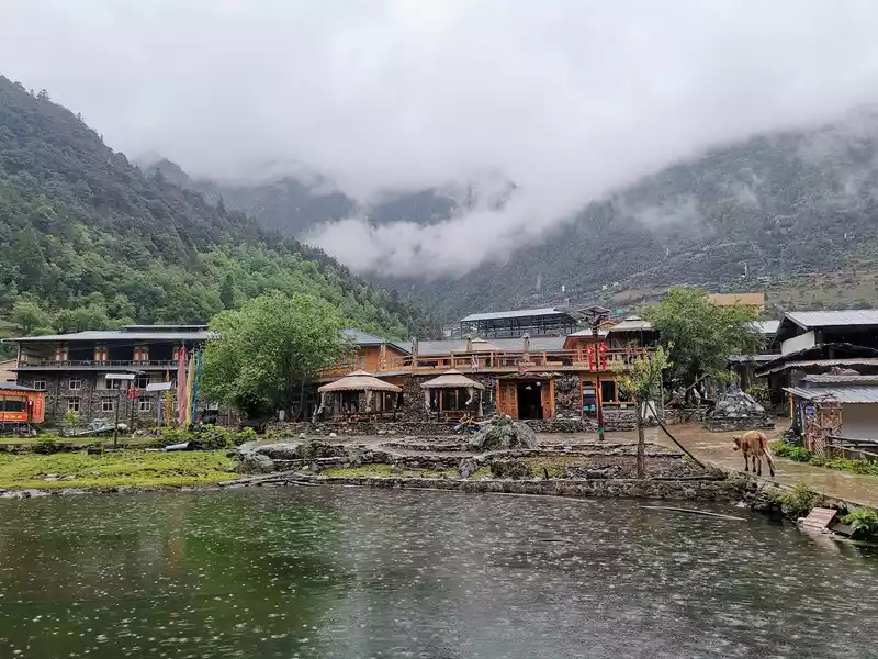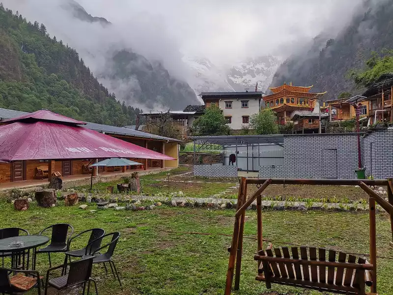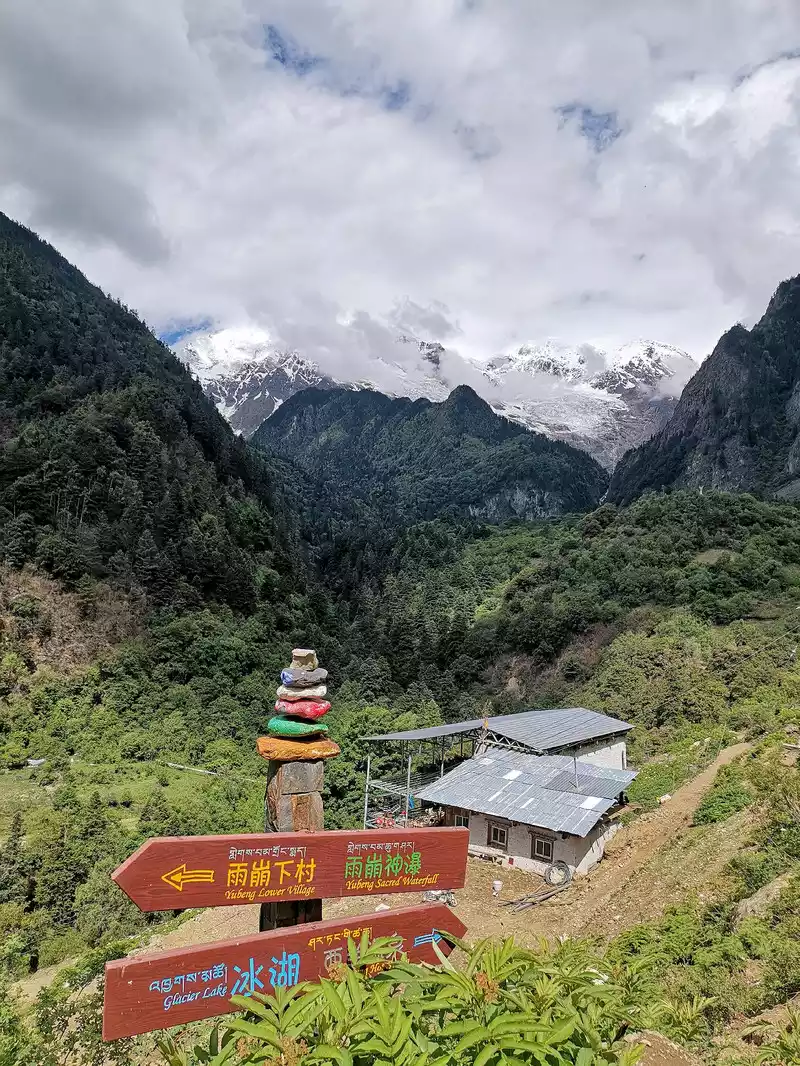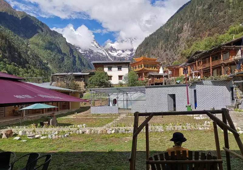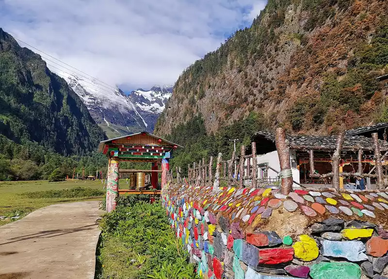 时间不早啦,向湖边返回啦,路过一家应该是距离雪山最近的民宿,彩色石块砌起的围栏很有藏族风情。