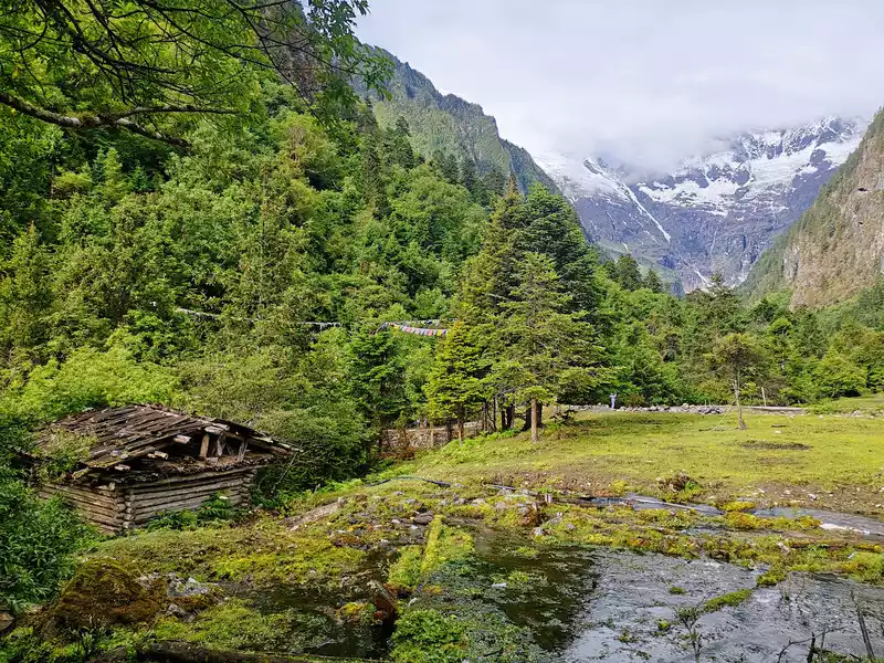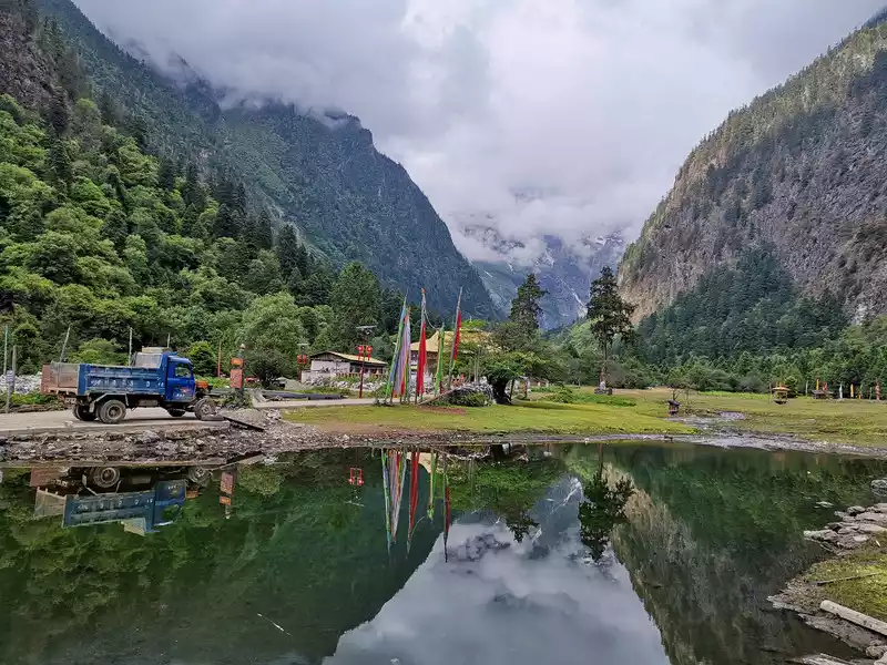 我们依然选择乘车出村。雨崩下村的乘车点就在小桥的一边,由下村至西当村费用为260元。我们决定徒步至上村乘车点,这可不是为了省60块钱哈,而是想一路再好好观赏一下这个美丽的世外桃源,在下村的这两天也没有再观赏到上村的景色,天气又这么给力,真的不舍得放弃啊。当然,同时又省了60元也很棒啊。