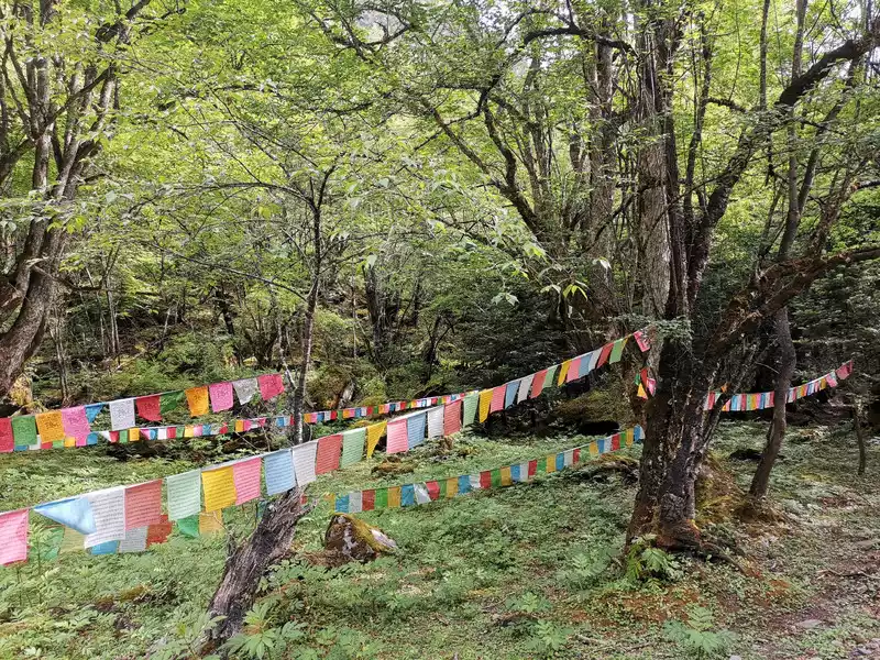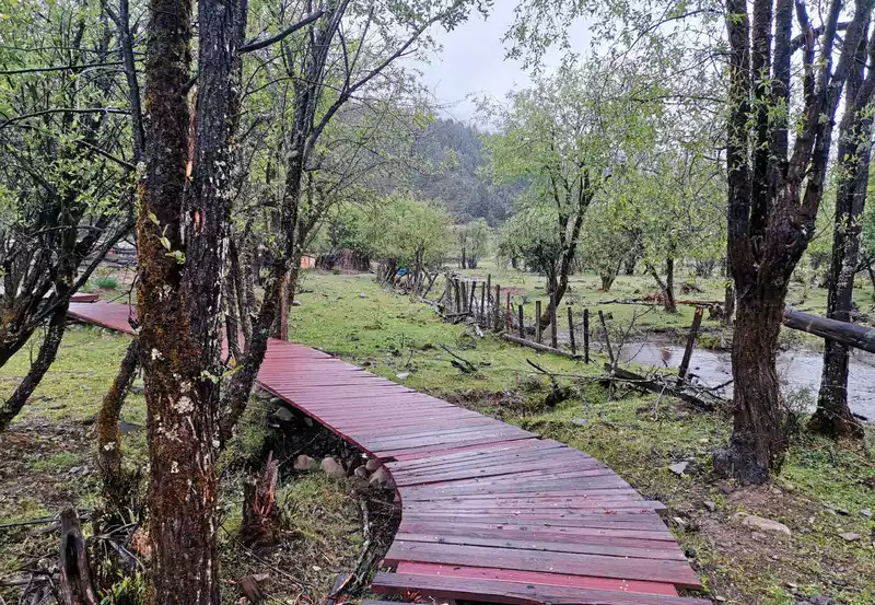 属都湖景区全程都是这样的栈道,而且均是平地,没有上上下下的坡度,景区内植被丰盛,所以虽然属都湖海拔3705米,但是没有一点高原的感觉, 当然也与我们行前做了充分的抗高反准备、又在香格里拉适应了很多天有关。