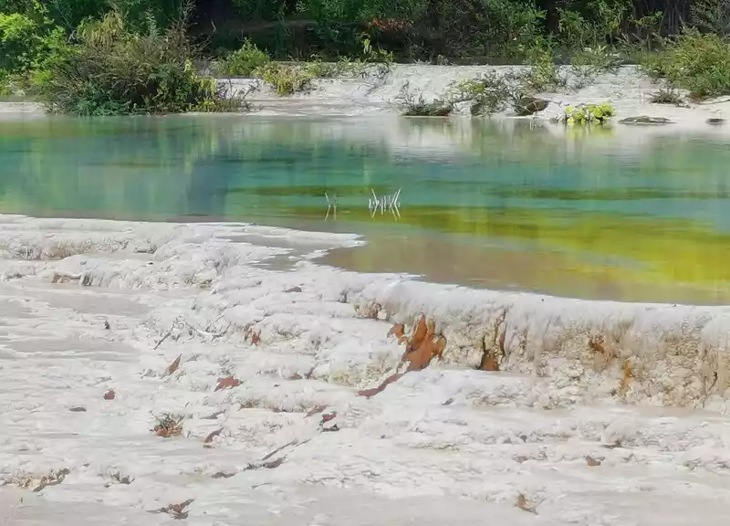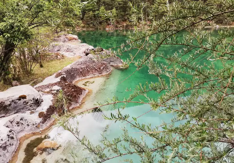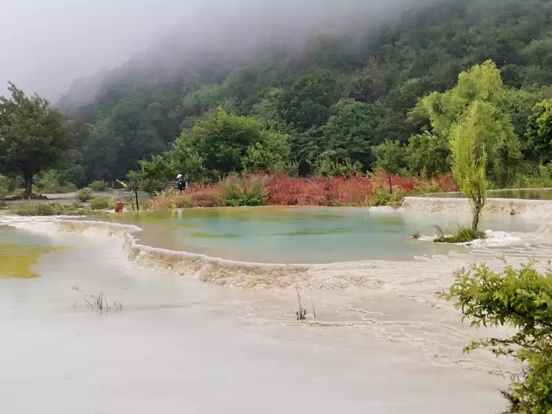 紧挨着山脚下的这片水台大而浅,水面则呈现着不同的色彩,淡蓝、玉白、鹅黄参差着,周边则围绕着红色、深绿、翠绿的树木,又是一种美妙无比的意境。