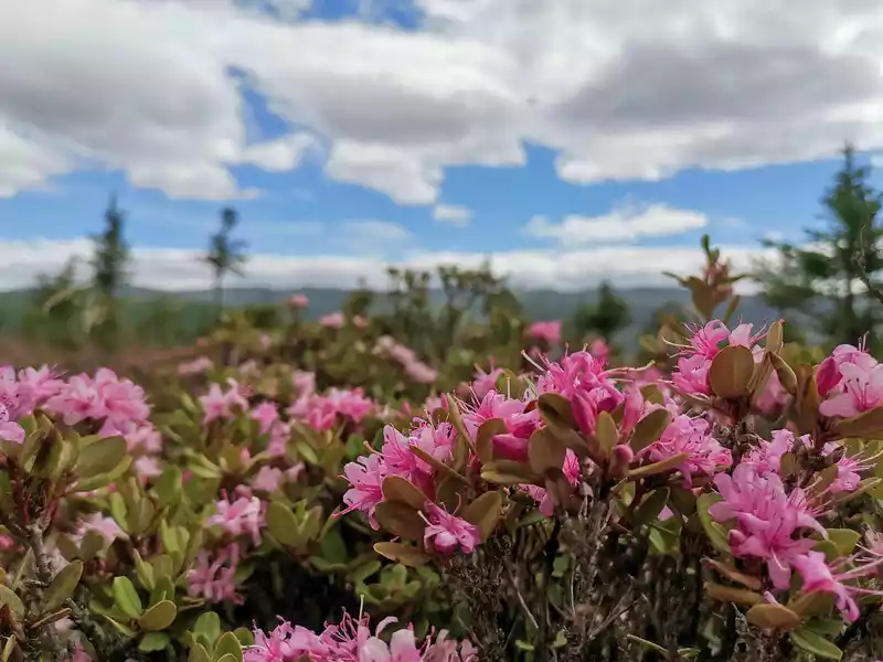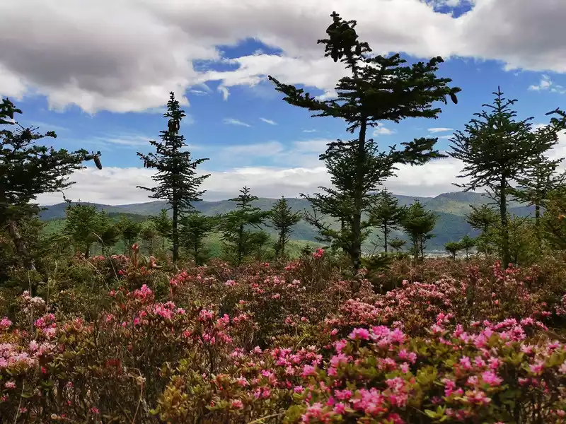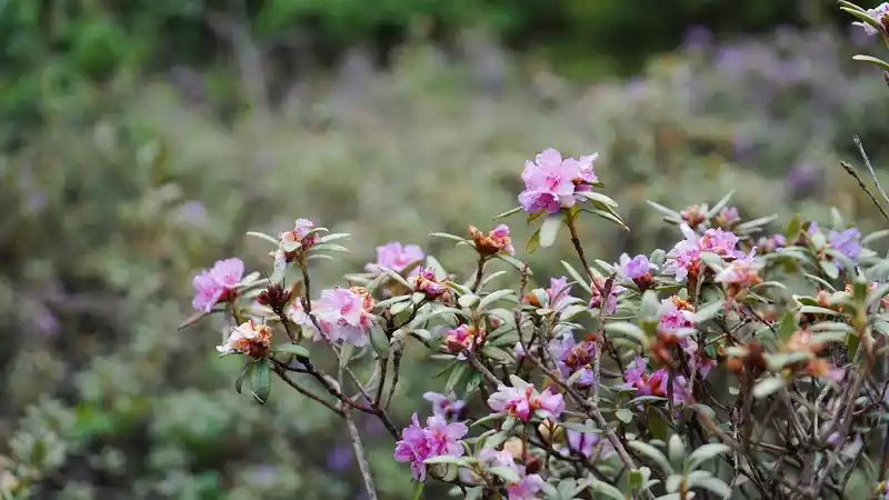 The alpine rhododendrons here are in full bloom from late May to mid-June, and we arrived on June 4th when they were in full bloom. Unlike the more common azaleas we see inland, the alpine azaleas here are smaller and appear to have less water. However, up close, the blossoms are still full and vibrant, and one can't help but marvel at the powerful vitality of these small flowers on the plateau.