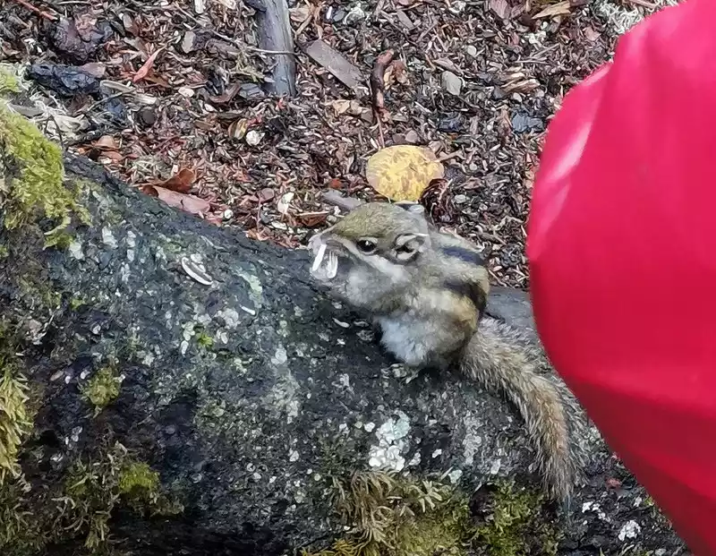 小松鼠跳来跳去一点不惧怕行人,如果喂它瓜子,它会敏捷地取走,背过身子蹲在树根处投入地吃了起来,吃完了便又过来讨要,很可爱很可爱的样子。