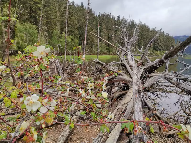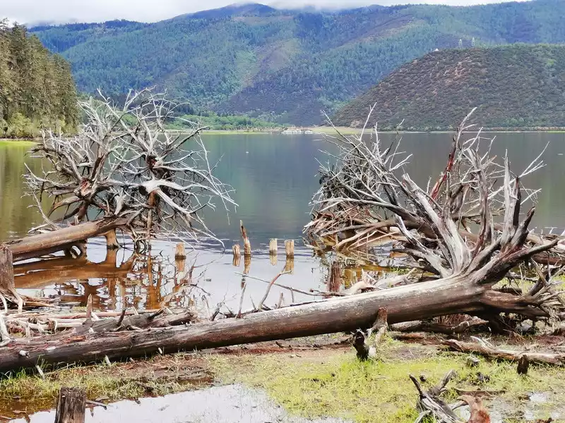 这是最后一段可以走近湖边的路段,这段湖边的草地更加茂盛、翠绿,映衬着岸边和水中的枯枝也有了生命力。